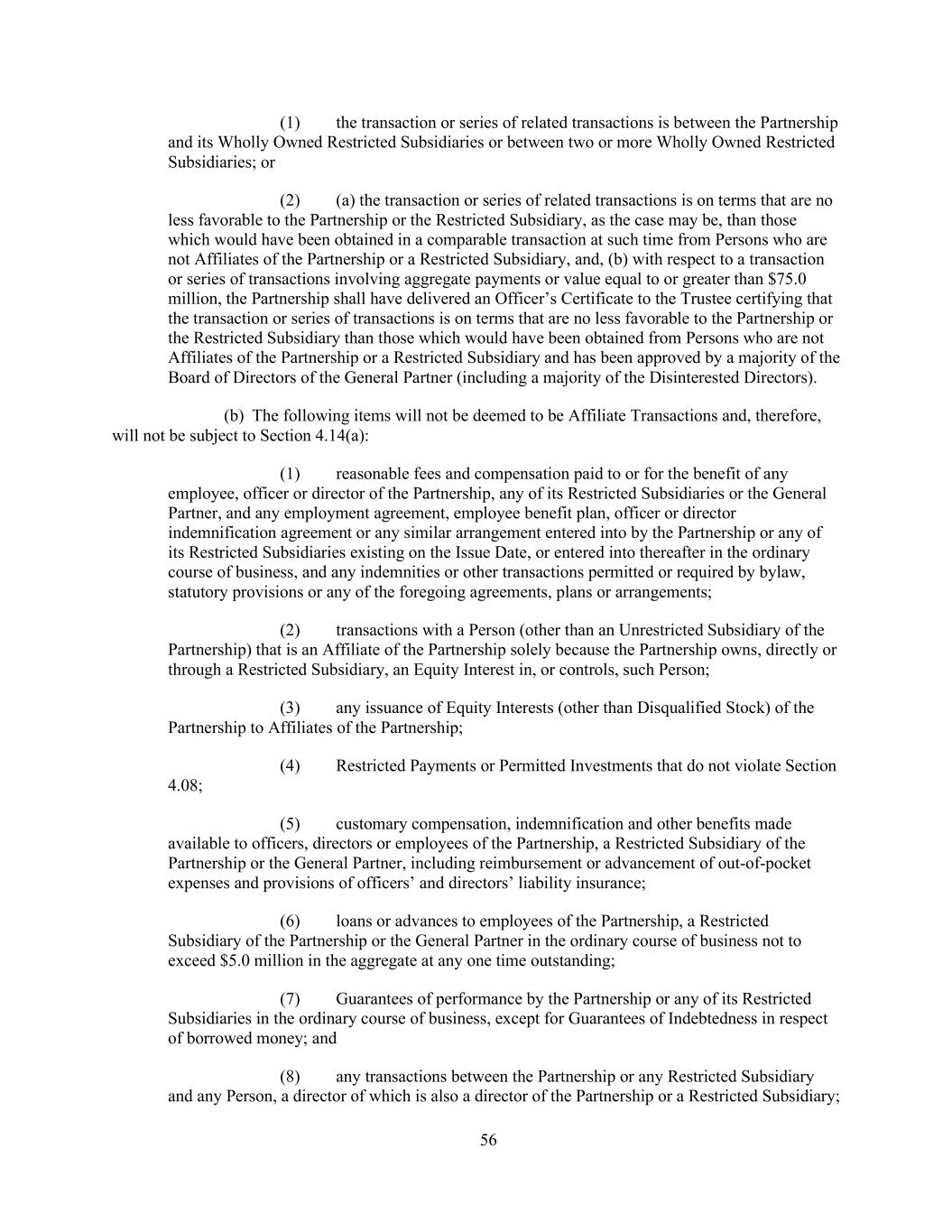 56 (1) the transaction or series of related transactions is between the Partnership and its Wholly Owned Restricted Subsidiaries or between two or more Wholly Owned Restricted Subsidiaries; or (2) (a) the transaction or series of related transactions is on terms that are no less favorable to the Partnership or the Restricted Subsidiary, as the case may be, than those which would have been obtained in a comparable transaction at such time from Persons who are not Affiliates of the Partnership or a Restricted Subsidiary, and, (b) with respect to a transaction or series of transactions involving aggregate payments or value equal to or greater than $75.0 million, the Partnership shall have delivered an Officer’s Certificate to the Trustee certifying that the transaction or series of transactions is on terms that are no less favorable to the Partnership or the Restricted Subsidiary than those which would have been obtained from Persons who are not Affiliates of the Partnership or a Restricted Subsidiary and has been approved by a majority of the Board of Directors of the General Partner (including a majority of the Disinterested Directors). (b) The following items will not be deemed to be Affiliate Transactions and, therefore, will not be subject to Section 4.14(a): (1) reasonable fees and compensation paid to or for the benefit of any employee, officer or director of the Partnership, any of its Restricted Subsidiaries or the General Partner, and any employment agreement, employee benefit plan, officer or director indemnification agreement or any similar arrangement entered into by the Partnership or any of its Restricted Subsidiaries existing on the Issue Date, or entered into thereafter in the ordinary course of business, and any indemnities or other transactions permitted or required by bylaw, statutory provisions or any of the foregoing agreements, plans or arrangements; (2) transactions with a Person (other than an Unrestricted Subsidiary of the Partnership) that is an Affiliate of the Partnership solely because the Partnership owns, directly or through a Restricted Subsidiary, an Equity Interest in, or controls, such Person; (3) any issuance of Equity Interests (other than Disqualified Stock) of the Partnership to Affiliates of the Partnership; (4) Restricted Payments or Permitted Investments that do not violate Section 4.08; (5) customary compensation, indemnification and other benefits made available to officers, directors or employees of the Partnership, a Restricted Subsidiary of the Partnership or the General Partner, including reimbursement or advancement of out-of-pocket expenses and provisions of officers’ and directors’ liability insurance; (6) loans or advances to employees of the Partnership, a Restricted Subsidiary of the Partnership or the General Partner in the ordinary course of business not to exceed $5.0 million in the aggregate at any one time outstanding; (7) Guarantees of performance by the Partnership or any of its Restricted Subsidiaries in the ordinary course of business, except for Guarantees of Indebtedness in respect of borrowed money; and (8) any transactions between the Partnership or any Restricted Subsidiary and any Person, a director of which is also a director of the Partnership or a Restricted Subsidiary;