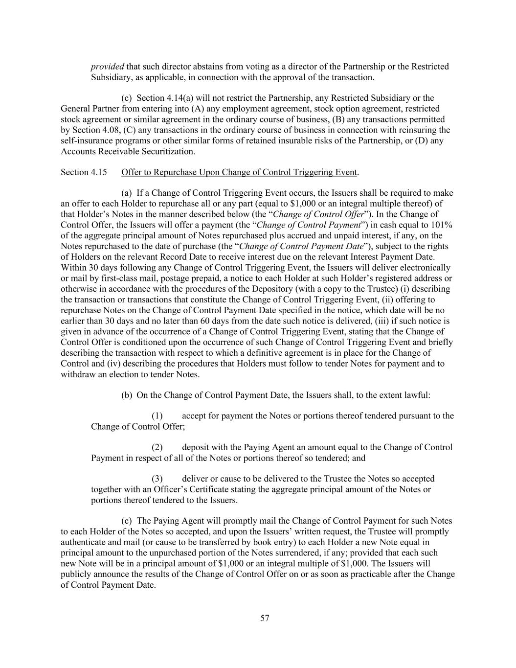 57 provided that such director abstains from voting as a director of the Partnership or the Restricted Subsidiary, as applicable, in connection with the approval of the transaction. (c) Section 4.14(a) will not restrict the Partnership, any Restricted Subsidiary or the General Partner from entering into (A) any employment agreement, stock option agreement, restricted stock agreement or similar agreement in the ordinary course of business, (B) any transactions permitted by Section 4.08, (C) any transactions in the ordinary course of business in connection with reinsuring the self-insurance programs or other similar forms of retained insurable risks of the Partnership, or (D) any Accounts Receivable Securitization. Section 4.15 Offer to Repurchase Upon Change of Control Triggering Event. (a) If a Change of Control Triggering Event occurs, the Issuers shall be required to make an offer to each Holder to repurchase all or any part (equal to $1,000 or an integral multiple thereof) of that Holder’s Notes in the manner described below (the “Change of Control Offer”). In the Change of Control Offer, the Issuers will offer a payment (the “Change of Control Payment”) in cash equal to 101% of the aggregate principal amount of Notes repurchased plus accrued and unpaid interest, if any, on the Notes repurchased to the date of purchase (the “Change of Control Payment Date”), subject to the rights of Holders on the relevant Record Date to receive interest due on the relevant Interest Payment Date. Within 30 days following any Change of Control Triggering Event, the Issuers will deliver electronically or mail by first-class mail, postage prepaid, a notice to each Holder at such Holder’s registered address or otherwise in accordance with the procedures of the Depository (with a copy to the Trustee) (i) describing the transaction or transactions that constitute the Change of Control Triggering Event, (ii) offering to repurchase Notes on the Change of Control Payment Date specified in the notice, which date will be no earlier than 30 days and no later than 60 days from the date such notice is delivered, (iii) if such notice is given in advance of the occurrence of a Change of Control Triggering Event, stating that the Change of Control Offer is conditioned upon the occurrence of such Change of Control Triggering Event and briefly describing the transaction with respect to which a definitive agreement is in place for the Change of Control and (iv) describing the procedures that Holders must follow to tender Notes for payment and to withdraw an election to tender Notes. (b) On the Change of Control Payment Date, the Issuers shall, to the extent lawful: (1) accept for payment the Notes or portions thereof tendered pursuant to the Change of Control Offer; (2) deposit with the Paying Agent an amount equal to the Change of Control Payment in respect of all of the Notes or portions thereof so tendered; and (3) deliver or cause to be delivered to the Trustee the Notes so accepted together with an Officer’s Certificate stating the aggregate principal amount of the Notes or portions thereof tendered to the Issuers. (c) The Paying Agent will promptly mail the Change of Control Payment for such Notes to each Holder of the Notes so accepted, and upon the Issuers’ written request, the Trustee will promptly authenticate and mail (or cause to be transferred by book entry) to each Holder a new Note equal in principal amount to the unpurchased portion of the Notes surrendered, if any; provided that each such new Note will be in a principal amount of $1,000 or an integral multiple of $1,000. The Issuers will publicly announce the results of the Change of Control Offer on or as soon as practicable after the Change of Control Payment Date.