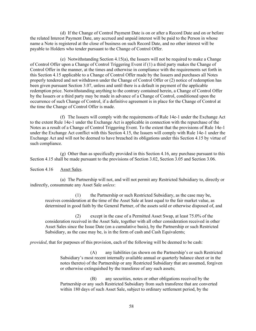 58 (d) If the Change of Control Payment Date is on or after a Record Date and on or before the related Interest Payment Date, any accrued and unpaid interest will be paid to the Person in whose name a Note is registered at the close of business on such Record Date, and no other interest will be payable to Holders who tender pursuant to the Change of Control Offer. (e) Notwithstanding Section 4.15(a), the Issuers will not be required to make a Change of Control Offer upon a Change of Control Triggering Event if (1) a third party makes the Change of Control Offer in the manner, at the times and otherwise in compliance with the requirements set forth in this Section 4.15 applicable to a Change of Control Offer made by the Issuers and purchases all Notes properly tendered and not withdrawn under the Change of Control Offer or (2) notice of redemption has been given pursuant Section 3.07, unless and until there is a default in payment of the applicable redemption price. Notwithstanding anything to the contrary contained herein, a Change of Control Offer by the Issuers or a third party may be made in advance of a Change of Control, conditioned upon the occurrence of such Change of Control, if a definitive agreement is in place for the Change of Control at the time the Change of Control Offer is made. (f) The Issuers will comply with the requirements of Rule 14e-1 under the Exchange Act to the extent Rule 14e-1 under the Exchange Act is applicable in connection with the repurchase of the Notes as a result of a Change of Control Triggering Event. To the extent that the provisions of Rule 14e-1 under the Exchange Act conflict with this Section 4.15, the Issuers will comply with Rule 14e-1 under the Exchange Act and will not be deemed to have breached its obligations under this Section 4.15 by virtue of such compliance. (g) Other than as specifically provided in this Section 4.16, any purchase pursuant to this Section 4.15 shall be made pursuant to the provisions of Section 3.02, Section 3.05 and Section 3.06. Section 4.16 Asset Sales. (a) The Partnership will not, and will not permit any Restricted Subsidiary to, directly or indirectly, consummate any Asset Sale unless: (1) the Partnership or such Restricted Subsidiary, as the case may be, receives consideration at the time of the Asset Sale at least equal to the fair market value, as determined in good faith by the General Partner, of the assets sold or otherwise disposed of, and (2) except in the case of a Permitted Asset Swap, at least 75.0% of the consideration received in the Asset Sale, together with all other consideration received in other Asset Sales since the Issue Date (on a cumulative basis), by the Partnership or such Restricted Subsidiary, as the case may be, is in the form of cash and Cash Equivalents; provided, that for purposes of this provision, each of the following will be deemed to be cash: (A) any liabilities (as shown on the Partnership’s or such Restricted Subsidiary’s most recent internally available annual or quarterly balance sheet or in the notes thereto) of the Partnership or any Restricted Subsidiary that are assumed, forgiven or otherwise extinguished by the transferee of any such assets; (B) any securities, notes or other obligations received by the Partnership or any such Restricted Subsidiary from such transferee that are converted within 180 days of such Asset Sale, subject to ordinary settlement period, by the