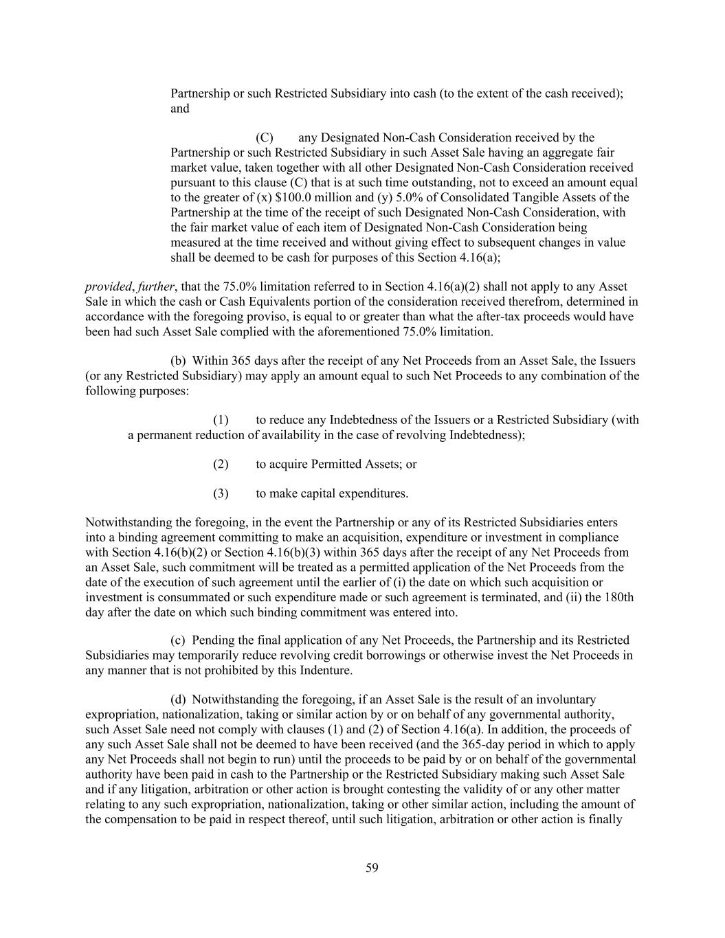 59 Partnership or such Restricted Subsidiary into cash (to the extent of the cash received); and (C) any Designated Non-Cash Consideration received by the Partnership or such Restricted Subsidiary in such Asset Sale having an aggregate fair market value, taken together with all other Designated Non-Cash Consideration received pursuant to this clause (C) that is at such time outstanding, not to exceed an amount equal to the greater of (x) $100.0 million and (y) 5.0% of Consolidated Tangible Assets of the Partnership at the time of the receipt of such Designated Non-Cash Consideration, with the fair market value of each item of Designated Non-Cash Consideration being measured at the time received and without giving effect to subsequent changes in value shall be deemed to be cash for purposes of this Section 4.16(a); provided, further, that the 75.0% limitation referred to in Section 4.16(a)(2) shall not apply to any Asset Sale in which the cash or Cash Equivalents portion of the consideration received therefrom, determined in accordance with the foregoing proviso, is equal to or greater than what the after-tax proceeds would have been had such Asset Sale complied with the aforementioned 75.0% limitation. (b) Within 365 days after the receipt of any Net Proceeds from an Asset Sale, the Issuers (or any Restricted Subsidiary) may apply an amount equal to such Net Proceeds to any combination of the following purposes: (1) to reduce any Indebtedness of the Issuers or a Restricted Subsidiary (with a permanent reduction of availability in the case of revolving Indebtedness); (2) to acquire Permitted Assets; or (3) to make capital expenditures. Notwithstanding the foregoing, in the event the Partnership or any of its Restricted Subsidiaries enters into a binding agreement committing to make an acquisition, expenditure or investment in compliance with Section 4.16(b)(2) or Section 4.16(b)(3) within 365 days after the receipt of any Net Proceeds from an Asset Sale, such commitment will be treated as a permitted application of the Net Proceeds from the date of the execution of such agreement until the earlier of (i) the date on which such acquisition or investment is consummated or such expenditure made or such agreement is terminated, and (ii) the 180th day after the date on which such binding commitment was entered into. (c) Pending the final application of any Net Proceeds, the Partnership and its Restricted Subsidiaries may temporarily reduce revolving credit borrowings or otherwise invest the Net Proceeds in any manner that is not prohibited by this Indenture. (d) Notwithstanding the foregoing, if an Asset Sale is the result of an involuntary expropriation, nationalization, taking or similar action by or on behalf of any governmental authority, such Asset Sale need not comply with clauses (1) and (2) of Section 4.16(a). In addition, the proceeds of any such Asset Sale shall not be deemed to have been received (and the 365-day period in which to apply any Net Proceeds shall not begin to run) until the proceeds to be paid by or on behalf of the governmental authority have been paid in cash to the Partnership or the Restricted Subsidiary making such Asset Sale and if any litigation, arbitration or other action is brought contesting the validity of or any other matter relating to any such expropriation, nationalization, taking or other similar action, including the amount of the compensation to be paid in respect thereof, until such litigation, arbitration or other action is finally