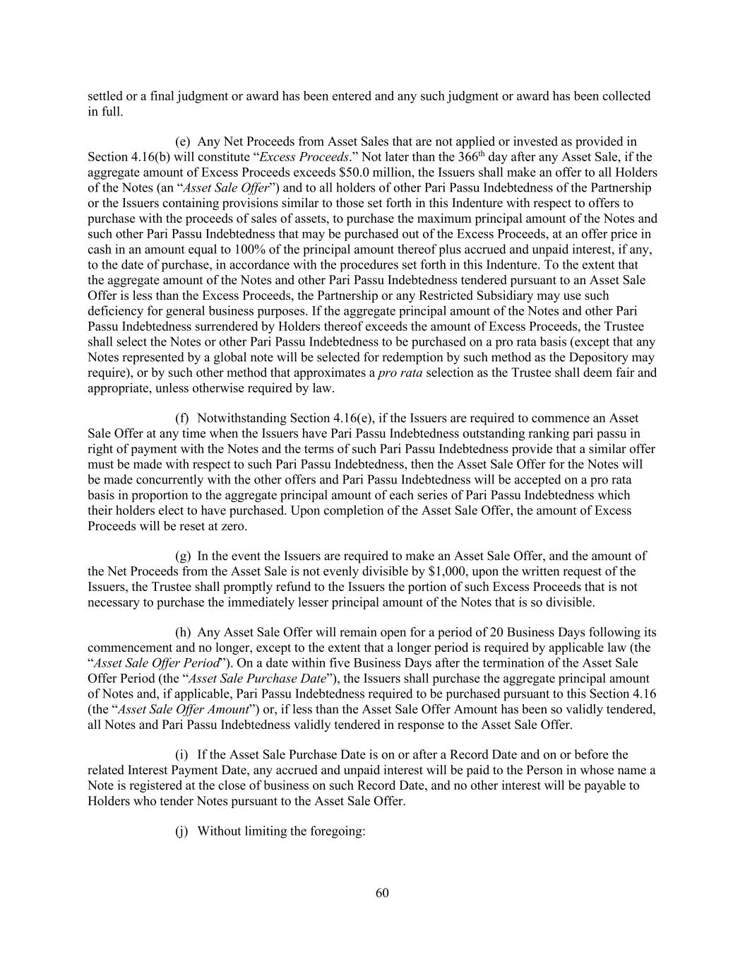 60 settled or a final judgment or award has been entered and any such judgment or award has been collected in full. (e) Any Net Proceeds from Asset Sales that are not applied or invested as provided in Section 4.16(b) will constitute “Excess Proceeds.” Not later than the 366th day after any Asset Sale, if the aggregate amount of Excess Proceeds exceeds $50.0 million, the Issuers shall make an offer to all Holders of the Notes (an “Asset Sale Offer”) and to all holders of other Pari Passu Indebtedness of the Partnership or the Issuers containing provisions similar to those set forth in this Indenture with respect to offers to purchase with the proceeds of sales of assets, to purchase the maximum principal amount of the Notes and such other Pari Passu Indebtedness that may be purchased out of the Excess Proceeds, at an offer price in cash in an amount equal to 100% of the principal amount thereof plus accrued and unpaid interest, if any, to the date of purchase, in accordance with the procedures set forth in this Indenture. To the extent that the aggregate amount of the Notes and other Pari Passu Indebtedness tendered pursuant to an Asset Sale Offer is less than the Excess Proceeds, the Partnership or any Restricted Subsidiary may use such deficiency for general business purposes. If the aggregate principal amount of the Notes and other Pari Passu Indebtedness surrendered by Holders thereof exceeds the amount of Excess Proceeds, the Trustee shall select the Notes or other Pari Passu Indebtedness to be purchased on a pro rata basis (except that any Notes represented by a global note will be selected for redemption by such method as the Depository may require), or by such other method that approximates a pro rata selection as the Trustee shall deem fair and appropriate, unless otherwise required by law. (f) Notwithstanding Section 4.16(e), if the Issuers are required to commence an Asset Sale Offer at any time when the Issuers have Pari Passu Indebtedness outstanding ranking pari passu in right of payment with the Notes and the terms of such Pari Passu Indebtedness provide that a similar offer must be made with respect to such Pari Passu Indebtedness, then the Asset Sale Offer for the Notes will be made concurrently with the other offers and Pari Passu Indebtedness will be accepted on a pro rata basis in proportion to the aggregate principal amount of each series of Pari Passu Indebtedness which their holders elect to have purchased. Upon completion of the Asset Sale Offer, the amount of Excess Proceeds will be reset at zero. (g) In the event the Issuers are required to make an Asset Sale Offer, and the amount of the Net Proceeds from the Asset Sale is not evenly divisible by $1,000, upon the written request of the Issuers, the Trustee shall promptly refund to the Issuers the portion of such Excess Proceeds that is not necessary to purchase the immediately lesser principal amount of the Notes that is so divisible. (h) Any Asset Sale Offer will remain open for a period of 20 Business Days following its commencement and no longer, except to the extent that a longer period is required by applicable law (the “Asset Sale Offer Period”). On a date within five Business Days after the termination of the Asset Sale Offer Period (the “Asset Sale Purchase Date”), the Issuers shall purchase the aggregate principal amount of Notes and, if applicable, Pari Passu Indebtedness required to be purchased pursuant to this Section 4.16 (the “Asset Sale Offer Amount”) or, if less than the Asset Sale Offer Amount has been so validly tendered, all Notes and Pari Passu Indebtedness validly tendered in response to the Asset Sale Offer. (i) If the Asset Sale Purchase Date is on or after a Record Date and on or before the related Interest Payment Date, any accrued and unpaid interest will be paid to the Person in whose name a Note is registered at the close of business on such Record Date, and no other interest will be payable to Holders who tender Notes pursuant to the Asset Sale Offer. (j) Without limiting the foregoing: