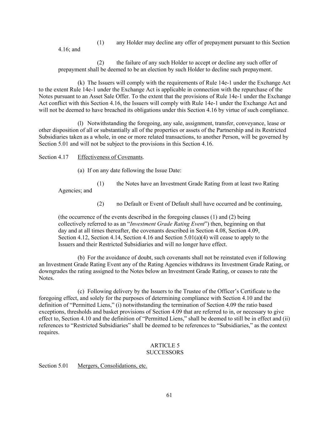 61 (1) any Holder may decline any offer of prepayment pursuant to this Section 4.16; and (2) the failure of any such Holder to accept or decline any such offer of prepayment shall be deemed to be an election by such Holder to decline such prepayment. (k) The Issuers will comply with the requirements of Rule 14e-1 under the Exchange Act to the extent Rule 14e-1 under the Exchange Act is applicable in connection with the repurchase of the Notes pursuant to an Asset Sale Offer. To the extent that the provisions of Rule 14e-1 under the Exchange Act conflict with this Section 4.16, the Issuers will comply with Rule 14e-1 under the Exchange Act and will not be deemed to have breached its obligations under this Section 4.16 by virtue of such compliance. (l) Notwithstanding the foregoing, any sale, assignment, transfer, conveyance, lease or other disposition of all or substantially all of the properties or assets of the Partnership and its Restricted Subsidiaries taken as a whole, in one or more related transactions, to another Person, will be governed by Section 5.01 and will not be subject to the provisions in this Section 4.16. Section 4.17 Effectiveness of Covenants. (a) If on any date following the Issue Date: (1) the Notes have an Investment Grade Rating from at least two Rating Agencies; and (2) no Default or Event of Default shall have occurred and be continuing, (the occurrence of the events described in the foregoing clauses (1) and (2) being collectively referred to as an “Investment Grade Rating Event”) then, beginning on that day and at all times thereafter, the covenants described in Section 4.08, Section 4.09, Section 4.12, Section 4.14, Section 4.16 and Section 5.01(a)(4) will cease to apply to the Issuers and their Restricted Subsidiaries and will no longer have effect. (b) For the avoidance of doubt, such covenants shall not be reinstated even if following an Investment Grade Rating Event any of the Rating Agencies withdraws its Investment Grade Rating, or downgrades the rating assigned to the Notes below an Investment Grade Rating, or ceases to rate the Notes. (c) Following delivery by the Issuers to the Trustee of the Officer’s Certificate to the foregoing effect, and solely for the purposes of determining compliance with Section 4.10 and the definition of “Permitted Liens,” (i) notwithstanding the termination of Section 4.09 the ratio based exceptions, thresholds and basket provisions of Section 4.09 that are referred to in, or necessary to give effect to, Section 4.10 and the definition of “Permitted Liens,” shall be deemed to still be in effect and (ii) references to “Restricted Subsidiaries” shall be deemed to be references to “Subsidiaries,” as the context requires. ARTICLE 5 SUCCESSORS Section 5.01 Mergers, Consolidations, etc.