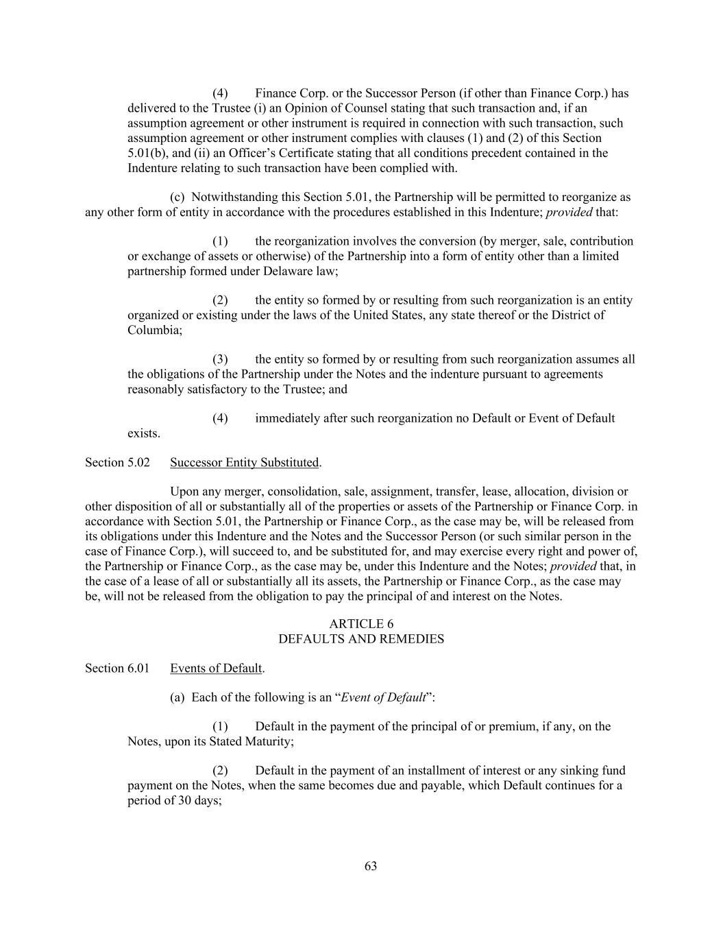 63 (4) Finance Corp. or the Successor Person (if other than Finance Corp.) has delivered to the Trustee (i) an Opinion of Counsel stating that such transaction and, if an assumption agreement or other instrument is required in connection with such transaction, such assumption agreement or other instrument complies with clauses (1) and (2) of this Section 5.01(b), and (ii) an Officer’s Certificate stating that all conditions precedent contained in the Indenture relating to such transaction have been complied with. (c) Notwithstanding this Section 5.01, the Partnership will be permitted to reorganize as any other form of entity in accordance with the procedures established in this Indenture; provided that: (1) the reorganization involves the conversion (by merger, sale, contribution or exchange of assets or otherwise) of the Partnership into a form of entity other than a limited partnership formed under Delaware law; (2) the entity so formed by or resulting from such reorganization is an entity organized or existing under the laws of the United States, any state thereof or the District of Columbia; (3) the entity so formed by or resulting from such reorganization assumes all the obligations of the Partnership under the Notes and the indenture pursuant to agreements reasonably satisfactory to the Trustee; and (4) immediately after such reorganization no Default or Event of Default exists. Section 5.02 Successor Entity Substituted. Upon any merger, consolidation, sale, assignment, transfer, lease, allocation, division or other disposition of all or substantially all of the properties or assets of the Partnership or Finance Corp. in accordance with Section 5.01, the Partnership or Finance Corp., as the case may be, will be released from its obligations under this Indenture and the Notes and the Successor Person (or such similar person in the case of Finance Corp.), will succeed to, and be substituted for, and may exercise every right and power of, the Partnership or Finance Corp., as the case may be, under this Indenture and the Notes; provided that, in the case of a lease of all or substantially all its assets, the Partnership or Finance Corp., as the case may be, will not be released from the obligation to pay the principal of and interest on the Notes. ARTICLE 6 DEFAULTS AND REMEDIES Section 6.01 Events of Default. (a) Each of the following is an “Event of Default”: (1) Default in the payment of the principal of or premium, if any, on the Notes, upon its Stated Maturity; (2) Default in the payment of an installment of interest or any sinking fund payment on the Notes, when the same becomes due and payable, which Default continues for a period of 30 days;