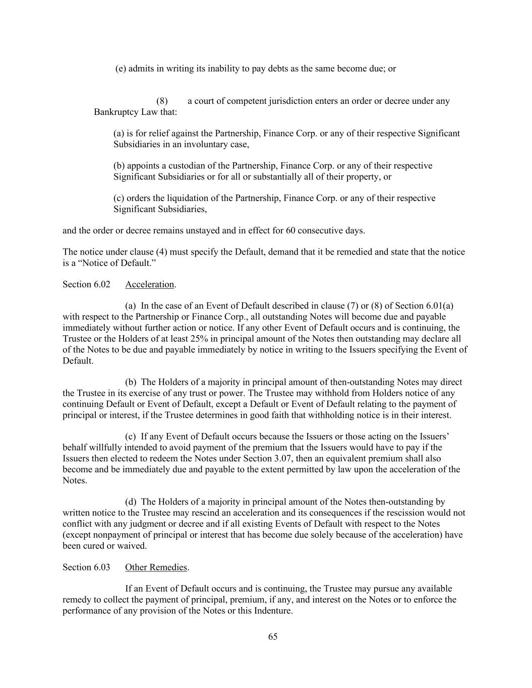 65 (e) admits in writing its inability to pay debts as the same become due; or (8) a court of competent jurisdiction enters an order or decree under any Bankruptcy Law that: (a) is for relief against the Partnership, Finance Corp. or any of their respective Significant Subsidiaries in an involuntary case, (b) appoints a custodian of the Partnership, Finance Corp. or any of their respective Significant Subsidiaries or for all or substantially all of their property, or (c) orders the liquidation of the Partnership, Finance Corp. or any of their respective Significant Subsidiaries, and the order or decree remains unstayed and in effect for 60 consecutive days. The notice under clause (4) must specify the Default, demand that it be remedied and state that the notice is a “Notice of Default.” Section 6.02 Acceleration. (a) In the case of an Event of Default described in clause (7) or (8) of Section 6.01(a) with respect to the Partnership or Finance Corp., all outstanding Notes will become due and payable immediately without further action or notice. If any other Event of Default occurs and is continuing, the Trustee or the Holders of at least 25% in principal amount of the Notes then outstanding may declare all of the Notes to be due and payable immediately by notice in writing to the Issuers specifying the Event of Default. (b) The Holders of a majority in principal amount of then-outstanding Notes may direct the Trustee in its exercise of any trust or power. The Trustee may withhold from Holders notice of any continuing Default or Event of Default, except a Default or Event of Default relating to the payment of principal or interest, if the Trustee determines in good faith that withholding notice is in their interest. (c) If any Event of Default occurs because the Issuers or those acting on the Issuers’ behalf willfully intended to avoid payment of the premium that the Issuers would have to pay if the Issuers then elected to redeem the Notes under Section 3.07, then an equivalent premium shall also become and be immediately due and payable to the extent permitted by law upon the acceleration of the Notes. (d) The Holders of a majority in principal amount of the Notes then-outstanding by written notice to the Trustee may rescind an acceleration and its consequences if the rescission would not conflict with any judgment or decree and if all existing Events of Default with respect to the Notes (except nonpayment of principal or interest that has become due solely because of the acceleration) have been cured or waived. Section 6.03 Other Remedies. If an Event of Default occurs and is continuing, the Trustee may pursue any available remedy to collect the payment of principal, premium, if any, and interest on the Notes or to enforce the performance of any provision of the Notes or this Indenture.