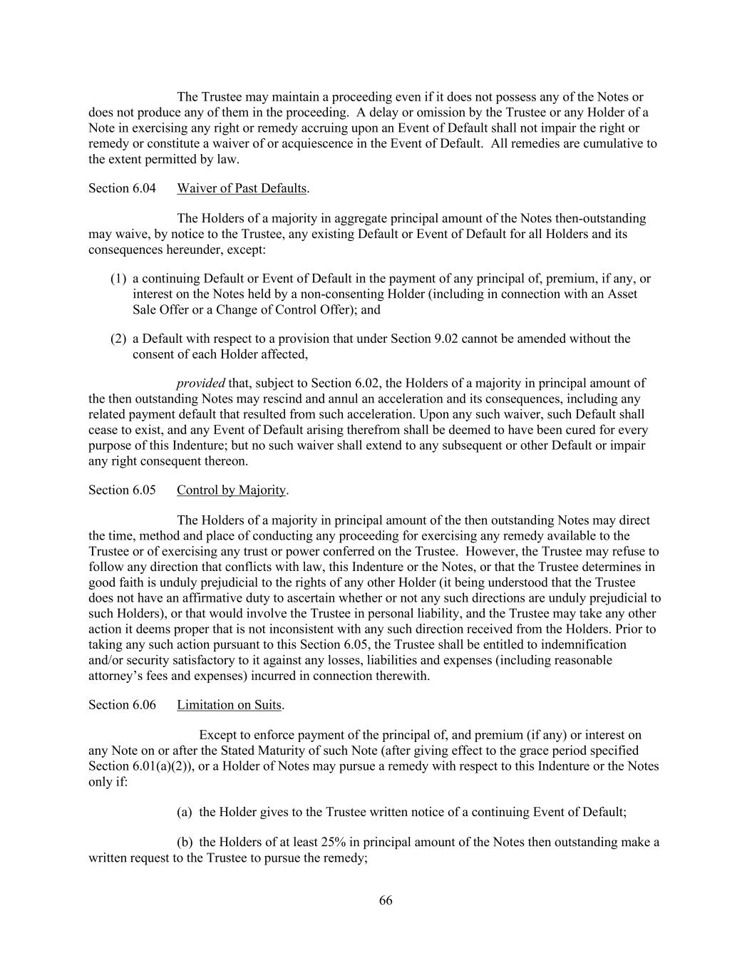 66 The Trustee may maintain a proceeding even if it does not possess any of the Notes or does not produce any of them in the proceeding. A delay or omission by the Trustee or any Holder of a Note in exercising any right or remedy accruing upon an Event of Default shall not impair the right or remedy or constitute a waiver of or acquiescence in the Event of Default. All remedies are cumulative to the extent permitted by law. Section 6.04 Waiver of Past Defaults. The Holders of a majority in aggregate principal amount of the Notes then-outstanding may waive, by notice to the Trustee, any existing Default or Event of Default for all Holders and its consequences hereunder, except: (1) a continuing Default or Event of Default in the payment of any principal of, premium, if any, or interest on the Notes held by a non-consenting Holder (including in connection with an Asset Sale Offer or a Change of Control Offer); and (2) a Default with respect to a provision that under Section 9.02 cannot be amended without the consent of each Holder affected, provided that, subject to Section 6.02, the Holders of a majority in principal amount of the then outstanding Notes may rescind and annul an acceleration and its consequences, including any related payment default that resulted from such acceleration. Upon any such waiver, such Default shall cease to exist, and any Event of Default arising therefrom shall be deemed to have been cured for every purpose of this Indenture; but no such waiver shall extend to any subsequent or other Default or impair any right consequent thereon. Section 6.05 Control by Majority. The Holders of a majority in principal amount of the then outstanding Notes may direct the time, method and place of conducting any proceeding for exercising any remedy available to the Trustee or of exercising any trust or power conferred on the Trustee. However, the Trustee may refuse to follow any direction that conflicts with law, this Indenture or the Notes, or that the Trustee determines in good faith is unduly prejudicial to the rights of any other Holder (it being understood that the Trustee does not have an affirmative duty to ascertain whether or not any such directions are unduly prejudicial to such Holders), or that would involve the Trustee in personal liability, and the Trustee may take any other action it deems proper that is not inconsistent with any such direction received from the Holders. Prior to taking any such action pursuant to this Section 6.05, the Trustee shall be entitled to indemnification and/or security satisfactory to it against any losses, liabilities and expenses (including reasonable attorney’s fees and expenses) incurred in connection therewith. Section 6.06 Limitation on Suits. Except to enforce payment of the principal of, and premium (if any) or interest on any Note on or after the Stated Maturity of such Note (after giving effect to the grace period specified Section 6.01(a)(2)), or a Holder of Notes may pursue a remedy with respect to this Indenture or the Notes only if: (a) the Holder gives to the Trustee written notice of a continuing Event of Default; (b) the Holders of at least 25% in principal amount of the Notes then outstanding make a written request to the Trustee to pursue the remedy;