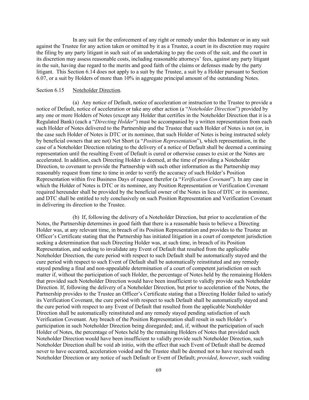69 In any suit for the enforcement of any right or remedy under this Indenture or in any suit against the Trustee for any action taken or omitted by it as a Trustee, a court in its discretion may require the filing by any party litigant in such suit of an undertaking to pay the costs of the suit, and the court in its discretion may assess reasonable costs, including reasonable attorneys’ fees, against any party litigant in the suit, having due regard to the merits and good faith of the claims or defenses made by the party litigant. This Section 6.14 does not apply to a suit by the Trustee, a suit by a Holder pursuant to Section 6.07, or a suit by Holders of more than 10% in aggregate principal amount of the outstanding Notes. Section 6.15 Noteholder Direction. (a) Any notice of Default, notice of acceleration or instruction to the Trustee to provide a notice of Default, notice of acceleration or take any other action (a “Noteholder Direction”) provided by any one or more Holders of Notes (except any Holder that certifies in the Noteholder Direction that it is a Regulated Bank) (each a “Directing Holder”) must be accompanied by a written representation from each such Holder of Notes delivered to the Partnership and the Trustee that such Holder of Notes is not (or, in the case such Holder of Notes is DTC or its nominee, that such Holder of Notes is being instructed solely by beneficial owners that are not) Net Short (a “Position Representation”), which representation, in the case of a Noteholder Direction relating to the delivery of a notice of Default shall be deemed a continuing representation until the resulting Event of Default is cured or otherwise ceases to exist or the Notes are accelerated. In addition, each Directing Holder is deemed, at the time of providing a Noteholder Direction, to covenant to provide the Partnership with such other information as the Partnership may reasonably request from time to time in order to verify the accuracy of such Holder’s Position Representation within five Business Days of request therefor (a “Verification Covenant”). In any case in which the Holder of Notes is DTC or its nominee, any Position Representation or Verification Covenant required hereunder shall be provided by the beneficial owner of the Notes in lieu of DTC or its nominee, and DTC shall be entitled to rely conclusively on such Position Representation and Verification Covenant in delivering its direction to the Trustee. (b) If, following the delivery of a Noteholder Direction, but prior to acceleration of the Notes, the Partnership determines in good faith that there is a reasonable basis to believe a Directing Holder was, at any relevant time, in breach of its Position Representation and provides to the Trustee an Officer’s Certificate stating that the Partnership has initiated litigation in a court of competent jurisdiction seeking a determination that such Directing Holder was, at such time, in breach of its Position Representation, and seeking to invalidate any Event of Default that resulted from the applicable Noteholder Direction, the cure period with respect to such Default shall be automatically stayed and the cure period with respect to such Event of Default shall be automatically reinstituted and any remedy stayed pending a final and non-appealable determination of a court of competent jurisdiction on such matter if, without the participation of such Holder, the percentage of Notes held by the remaining Holders that provided such Noteholder Direction would have been insufficient to validly provide such Noteholder Direction. If, following the delivery of a Noteholder Direction, but prior to acceleration of the Notes, the Partnership provides to the Trustee an Officer’s Certificate stating that a Directing Holder failed to satisfy its Verification Covenant, the cure period with respect to such Default shall be automatically stayed and the cure period with respect to any Event of Default that resulted from the applicable Noteholder Direction shall be automatically reinstituted and any remedy stayed pending satisfaction of such Verification Covenant. Any breach of the Position Representation shall result in such Holder’s participation in such Noteholder Direction being disregarded; and, if, without the participation of such Holder of Notes, the percentage of Notes held by the remaining Holders of Notes that provided such Noteholder Direction would have been insufficient to validly provide such Noteholder Direction, such Noteholder Direction shall be void ab initio, with the effect that such Event of Default shall be deemed never to have occurred, acceleration voided and the Trustee shall be deemed not to have received such Noteholder Direction or any notice of such Default or Event of Default; provided, however, such voiding
