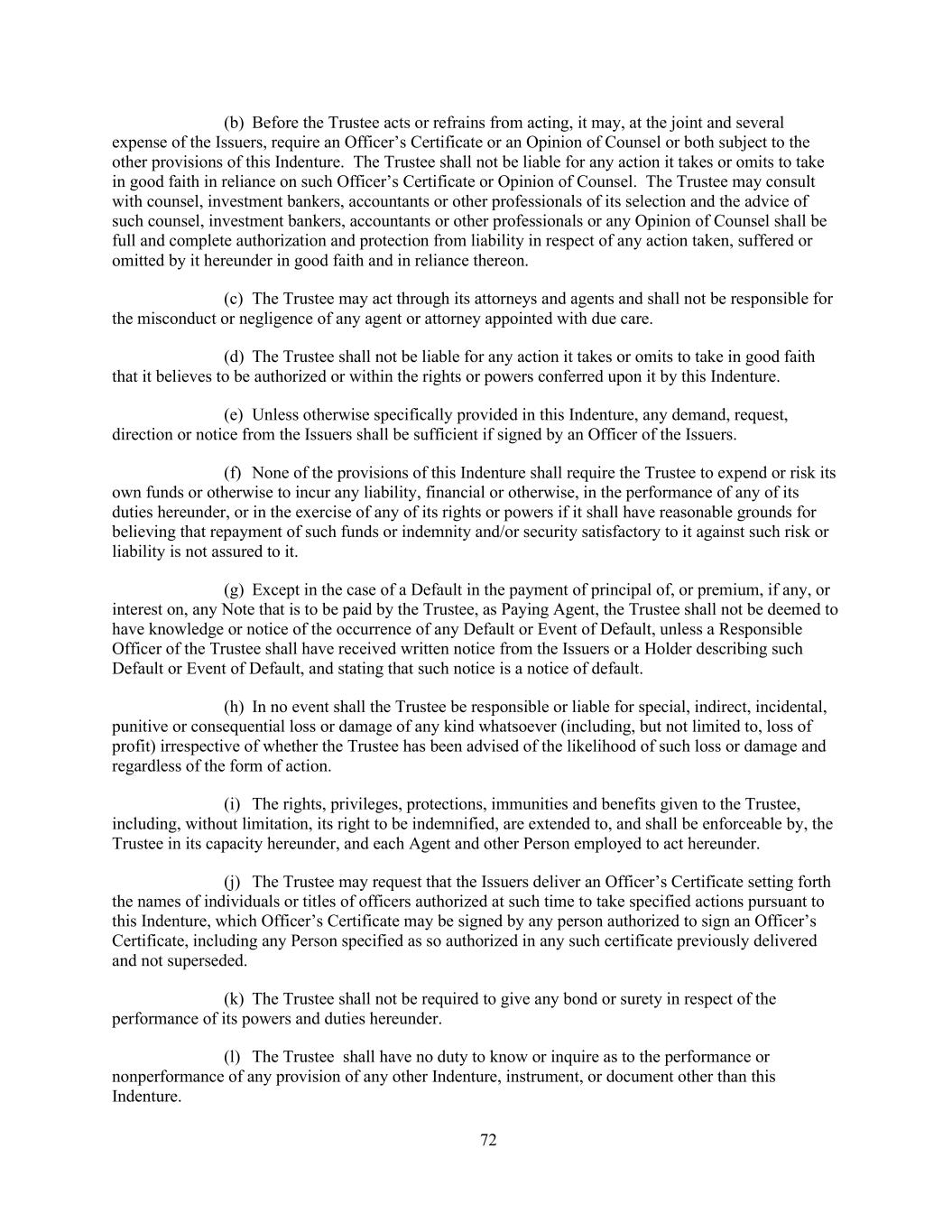 72 (b) Before the Trustee acts or refrains from acting, it may, at the joint and several expense of the Issuers, require an Officer’s Certificate or an Opinion of Counsel or both subject to the other provisions of this Indenture. The Trustee shall not be liable for any action it takes or omits to take in good faith in reliance on such Officer’s Certificate or Opinion of Counsel. The Trustee may consult with counsel, investment bankers, accountants or other professionals of its selection and the advice of such counsel, investment bankers, accountants or other professionals or any Opinion of Counsel shall be full and complete authorization and protection from liability in respect of any action taken, suffered or omitted by it hereunder in good faith and in reliance thereon. (c) The Trustee may act through its attorneys and agents and shall not be responsible for the misconduct or negligence of any agent or attorney appointed with due care. (d) The Trustee shall not be liable for any action it takes or omits to take in good faith that it believes to be authorized or within the rights or powers conferred upon it by this Indenture. (e) Unless otherwise specifically provided in this Indenture, any demand, request, direction or notice from the Issuers shall be sufficient if signed by an Officer of the Issuers. (f) None of the provisions of this Indenture shall require the Trustee to expend or risk its own funds or otherwise to incur any liability, financial or otherwise, in the performance of any of its duties hereunder, or in the exercise of any of its rights or powers if it shall have reasonable grounds for believing that repayment of such funds or indemnity and/or security satisfactory to it against such risk or liability is not assured to it. (g) Except in the case of a Default in the payment of principal of, or premium, if any, or interest on, any Note that is to be paid by the Trustee, as Paying Agent, the Trustee shall not be deemed to have knowledge or notice of the occurrence of any Default or Event of Default, unless a Responsible Officer of the Trustee shall have received written notice from the Issuers or a Holder describing such Default or Event of Default, and stating that such notice is a notice of default. (h) In no event shall the Trustee be responsible or liable for special, indirect, incidental, punitive or consequential loss or damage of any kind whatsoever (including, but not limited to, loss of profit) irrespective of whether the Trustee has been advised of the likelihood of such loss or damage and regardless of the form of action. (i) The rights, privileges, protections, immunities and benefits given to the Trustee, including, without limitation, its right to be indemnified, are extended to, and shall be enforceable by, the Trustee in its capacity hereunder, and each Agent and other Person employed to act hereunder. (j) The Trustee may request that the Issuers deliver an Officer’s Certificate setting forth the names of individuals or titles of officers authorized at such time to take specified actions pursuant to this Indenture, which Officer’s Certificate may be signed by any person authorized to sign an Officer’s Certificate, including any Person specified as so authorized in any such certificate previously delivered and not superseded. (k) The Trustee shall not be required to give any bond or surety in respect of the performance of its powers and duties hereunder. (l) The Trustee shall have no duty to know or inquire as to the performance or nonperformance of any provision of any other Indenture, instrument, or document other than this Indenture.