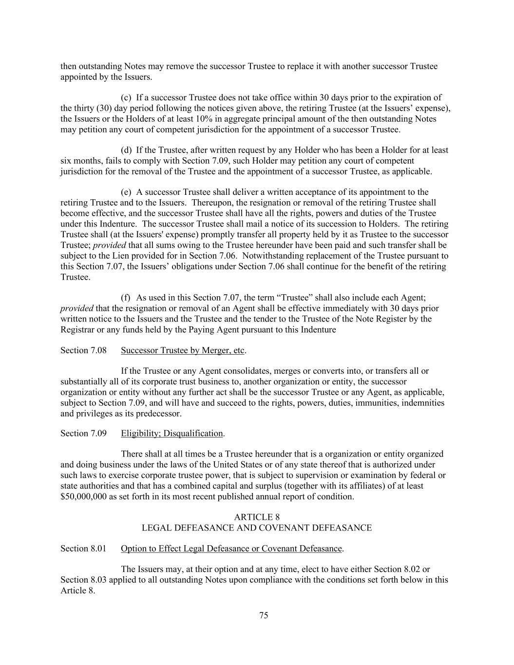 75 then outstanding Notes may remove the successor Trustee to replace it with another successor Trustee appointed by the Issuers. (c) If a successor Trustee does not take office within 30 days prior to the expiration of the thirty (30) day period following the notices given above, the retiring Trustee (at the Issuers’ expense), the Issuers or the Holders of at least 10% in aggregate principal amount of the then outstanding Notes may petition any court of competent jurisdiction for the appointment of a successor Trustee. (d) If the Trustee, after written request by any Holder who has been a Holder for at least six months, fails to comply with Section 7.09, such Holder may petition any court of competent jurisdiction for the removal of the Trustee and the appointment of a successor Trustee, as applicable. (e) A successor Trustee shall deliver a written acceptance of its appointment to the retiring Trustee and to the Issuers. Thereupon, the resignation or removal of the retiring Trustee shall become effective, and the successor Trustee shall have all the rights, powers and duties of the Trustee under this Indenture. The successor Trustee shall mail a notice of its succession to Holders. The retiring Trustee shall (at the Issuers' expense) promptly transfer all property held by it as Trustee to the successor Trustee; provided that all sums owing to the Trustee hereunder have been paid and such transfer shall be subject to the Lien provided for in Section 7.06. Notwithstanding replacement of the Trustee pursuant to this Section 7.07, the Issuers’ obligations under Section 7.06 shall continue for the benefit of the retiring Trustee. (f) As used in this Section 7.07, the term “Trustee” shall also include each Agent; provided that the resignation or removal of an Agent shall be effective immediately with 30 days prior written notice to the Issuers and the Trustee and the tender to the Trustee of the Note Register by the Registrar or any funds held by the Paying Agent pursuant to this Indenture Section 7.08 Successor Trustee by Merger, etc. If the Trustee or any Agent consolidates, merges or converts into, or transfers all or substantially all of its corporate trust business to, another organization or entity, the successor organization or entity without any further act shall be the successor Trustee or any Agent, as applicable, subject to Section 7.09, and will have and succeed to the rights, powers, duties, immunities, indemnities and privileges as its predecessor. Section 7.09 Eligibility; Disqualification. There shall at all times be a Trustee hereunder that is a organization or entity organized and doing business under the laws of the United States or of any state thereof that is authorized under such laws to exercise corporate trustee power, that is subject to supervision or examination by federal or state authorities and that has a combined capital and surplus (together with its affiliates) of at least $50,000,000 as set forth in its most recent published annual report of condition. ARTICLE 8 LEGAL DEFEASANCE AND COVENANT DEFEASANCE Section 8.01 Option to Effect Legal Defeasance or Covenant Defeasance. The Issuers may, at their option and at any time, elect to have either Section 8.02 or Section 8.03 applied to all outstanding Notes upon compliance with the conditions set forth below in this Article 8.