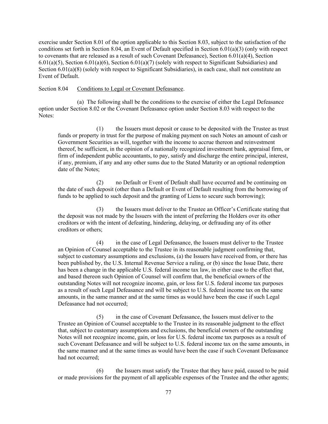 77 exercise under Section 8.01 of the option applicable to this Section 8.03, subject to the satisfaction of the conditions set forth in Section 8.04, an Event of Default specified in Section 6.01(a)(3) (only with respect to covenants that are released as a result of such Covenant Defeasance), Section 6.01(a)(4), Section 6.01(a)(5), Section 6.01(a)(6), Section 6.01(a)(7) (solely with respect to Significant Subsidiaries) and Section 6.01(a)(8) (solely with respect to Significant Subsidiaries), in each case, shall not constitute an Event of Default. Section 8.04 Conditions to Legal or Covenant Defeasance. (a) The following shall be the conditions to the exercise of either the Legal Defeasance option under Section 8.02 or the Covenant Defeasance option under Section 8.03 with respect to the Notes: (1) the Issuers must deposit or cause to be deposited with the Trustee as trust funds or property in trust for the purpose of making payment on such Notes an amount of cash or Government Securities as will, together with the income to accrue thereon and reinvestment thereof, be sufficient, in the opinion of a nationally recognized investment bank, appraisal firm, or firm of independent public accountants, to pay, satisfy and discharge the entire principal, interest, if any, premium, if any and any other sums due to the Stated Maturity or an optional redemption date of the Notes; (2) no Default or Event of Default shall have occurred and be continuing on the date of such deposit (other than a Default or Event of Default resulting from the borrowing of funds to be applied to such deposit and the granting of Liens to secure such borrowing); (3) the Issuers must deliver to the Trustee an Officer’s Certificate stating that the deposit was not made by the Issuers with the intent of preferring the Holders over its other creditors or with the intent of defeating, hindering, delaying, or defrauding any of its other creditors or others; (4) in the case of Legal Defeasance, the Issuers must deliver to the Trustee an Opinion of Counsel acceptable to the Trustee in its reasonable judgment confirming that, subject to customary assumptions and exclusions, (a) the Issuers have received from, or there has been published by, the U.S. Internal Revenue Service a ruling, or (b) since the Issue Date, there has been a change in the applicable U.S. federal income tax law, in either case to the effect that, and based thereon such Opinion of Counsel will confirm that, the beneficial owners of the outstanding Notes will not recognize income, gain, or loss for U.S. federal income tax purposes as a result of such Legal Defeasance and will be subject to U.S. federal income tax on the same amounts, in the same manner and at the same times as would have been the case if such Legal Defeasance had not occurred; (5) in the case of Covenant Defeasance, the Issuers must deliver to the Trustee an Opinion of Counsel acceptable to the Trustee in its reasonable judgment to the effect that, subject to customary assumptions and exclusions, the beneficial owners of the outstanding Notes will not recognize income, gain, or loss for U.S. federal income tax purposes as a result of such Covenant Defeasance and will be subject to U.S. federal income tax on the same amounts, in the same manner and at the same times as would have been the case if such Covenant Defeasance had not occurred; (6) the Issuers must satisfy the Trustee that they have paid, caused to be paid or made provisions for the payment of all applicable expenses of the Trustee and the other agents;