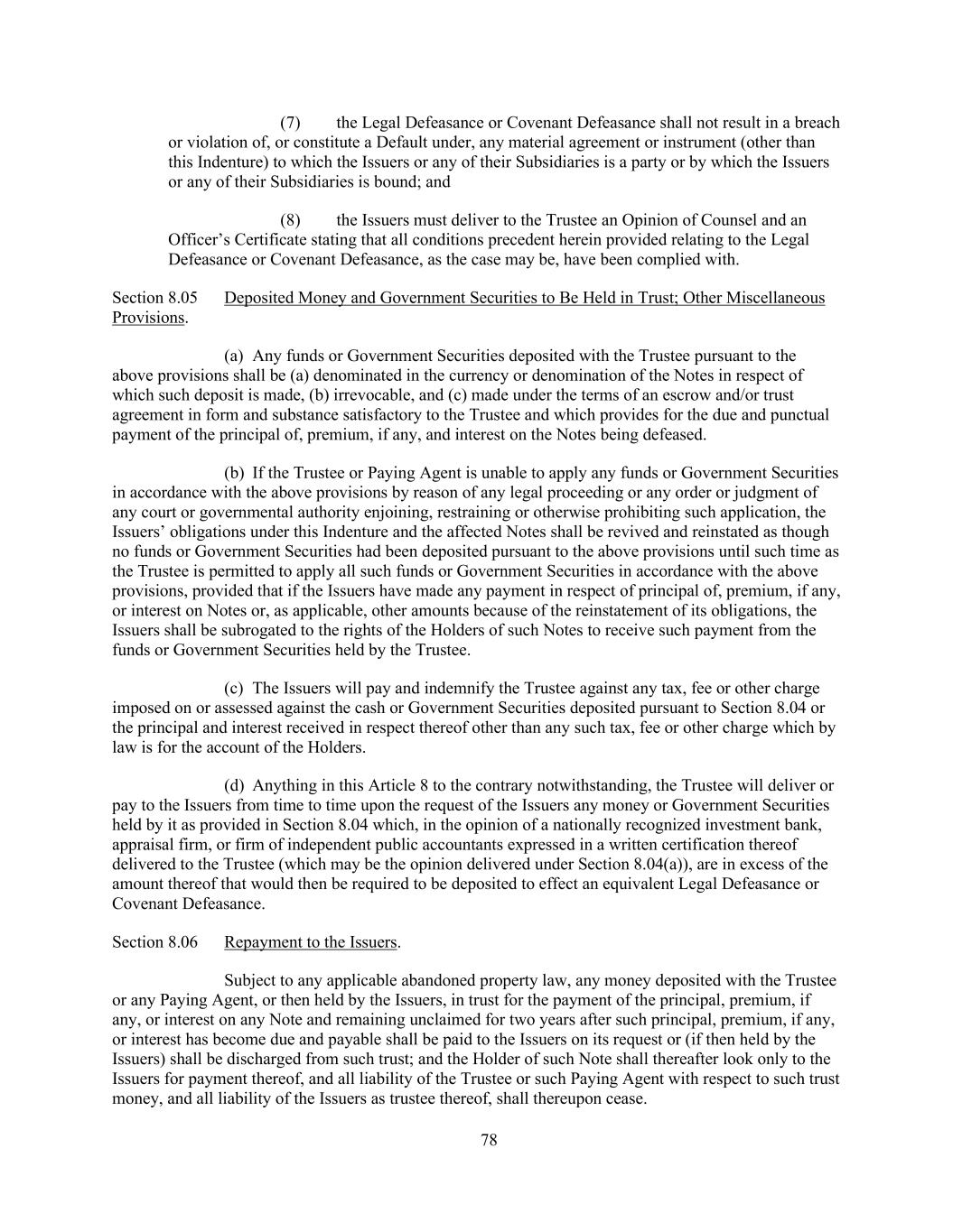 78 (7) the Legal Defeasance or Covenant Defeasance shall not result in a breach or violation of, or constitute a Default under, any material agreement or instrument (other than this Indenture) to which the Issuers or any of their Subsidiaries is a party or by which the Issuers or any of their Subsidiaries is bound; and (8) the Issuers must deliver to the Trustee an Opinion of Counsel and an Officer’s Certificate stating that all conditions precedent herein provided relating to the Legal Defeasance or Covenant Defeasance, as the case may be, have been complied with. Section 8.05 Deposited Money and Government Securities to Be Held in Trust; Other Miscellaneous Provisions. (a) Any funds or Government Securities deposited with the Trustee pursuant to the above provisions shall be (a) denominated in the currency or denomination of the Notes in respect of which such deposit is made, (b) irrevocable, and (c) made under the terms of an escrow and/or trust agreement in form and substance satisfactory to the Trustee and which provides for the due and punctual payment of the principal of, premium, if any, and interest on the Notes being defeased. (b) If the Trustee or Paying Agent is unable to apply any funds or Government Securities in accordance with the above provisions by reason of any legal proceeding or any order or judgment of any court or governmental authority enjoining, restraining or otherwise prohibiting such application, the Issuers’ obligations under this Indenture and the affected Notes shall be revived and reinstated as though no funds or Government Securities had been deposited pursuant to the above provisions until such time as the Trustee is permitted to apply all such funds or Government Securities in accordance with the above provisions, provided that if the Issuers have made any payment in respect of principal of, premium, if any, or interest on Notes or, as applicable, other amounts because of the reinstatement of its obligations, the Issuers shall be subrogated to the rights of the Holders of such Notes to receive such payment from the funds or Government Securities held by the Trustee. (c) The Issuers will pay and indemnify the Trustee against any tax, fee or other charge imposed on or assessed against the cash or Government Securities deposited pursuant to Section 8.04 or the principal and interest received in respect thereof other than any such tax, fee or other charge which by law is for the account of the Holders. (d) Anything in this Article 8 to the contrary notwithstanding, the Trustee will deliver or pay to the Issuers from time to time upon the request of the Issuers any money or Government Securities held by it as provided in Section 8.04 which, in the opinion of a nationally recognized investment bank, appraisal firm, or firm of independent public accountants expressed in a written certification thereof delivered to the Trustee (which may be the opinion delivered under Section 8.04(a)), are in excess of the amount thereof that would then be required to be deposited to effect an equivalent Legal Defeasance or Covenant Defeasance. Section 8.06 Repayment to the Issuers. Subject to any applicable abandoned property law, any money deposited with the Trustee or any Paying Agent, or then held by the Issuers, in trust for the payment of the principal, premium, if any, or interest on any Note and remaining unclaimed for two years after such principal, premium, if any, or interest has become due and payable shall be paid to the Issuers on its request or (if then held by the Issuers) shall be discharged from such trust; and the Holder of such Note shall thereafter look only to the Issuers for payment thereof, and all liability of the Trustee or such Paying Agent with respect to such trust money, and all liability of the Issuers as trustee thereof, shall thereupon cease.