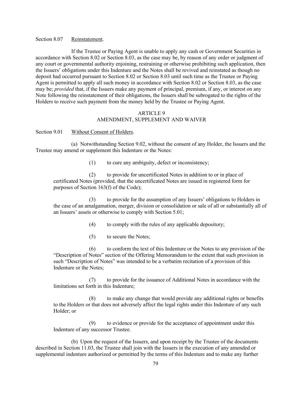 79 Section 8.07 Reinstatement. If the Trustee or Paying Agent is unable to apply any cash or Government Securities in accordance with Section 8.02 or Section 8.03, as the case may be, by reason of any order or judgment of any court or governmental authority enjoining, restraining or otherwise prohibiting such application, then the Issuers’ obligations under this Indenture and the Notes shall be revived and reinstated as though no deposit had occurred pursuant to Section 8.02 or Section 8.03 until such time as the Trustee or Paying Agent is permitted to apply all such money in accordance with Section 8.02 or Section 8.03, as the case may be; provided that, if the Issuers make any payment of principal, premium, if any, or interest on any Note following the reinstatement of their obligations, the Issuers shall be subrogated to the rights of the Holders to receive such payment from the money held by the Trustee or Paying Agent. ARTICLE 9 AMENDMENT, SUPPLEMENT AND WAIVER Section 9.01 Without Consent of Holders. (a) Notwithstanding Section 9.02, without the consent of any Holder, the Issuers and the Trustee may amend or supplement this Indenture or the Notes: (1) to cure any ambiguity, defect or inconsistency; (2) to provide for uncertificated Notes in addition to or in place of certificated Notes (provided, that the uncertificated Notes are issued in registered form for purposes of Section 163(f) of the Code); (3) to provide for the assumption of any Issuers’ obligations to Holders in the case of an amalgamation, merger, division or consolidation or sale of all or substantially all of an Issuers’ assets or otherwise to comply with Section 5.01; (4) to comply with the rules of any applicable depository; (5) to secure the Notes; (6) to conform the text of this Indenture or the Notes to any provision of the “Description of Notes” section of the Offering Memorandum to the extent that such provision in such “Description of Notes” was intended to be a verbatim recitation of a provision of this Indenture or the Notes; (7) to provide for the issuance of Additional Notes in accordance with the limitations set forth in this Indenture; (8) to make any change that would provide any additional rights or benefits to the Holders or that does not adversely affect the legal rights under this Indenture of any such Holder; or (9) to evidence or provide for the acceptance of appointment under this Indenture of any successor Trustee. (b) Upon the request of the Issuers, and upon receipt by the Trustee of the documents described in Section 11.03, the Trustee shall join with the Issuers in the execution of any amended or supplemental indenture authorized or permitted by the terms of this Indenture and to make any further