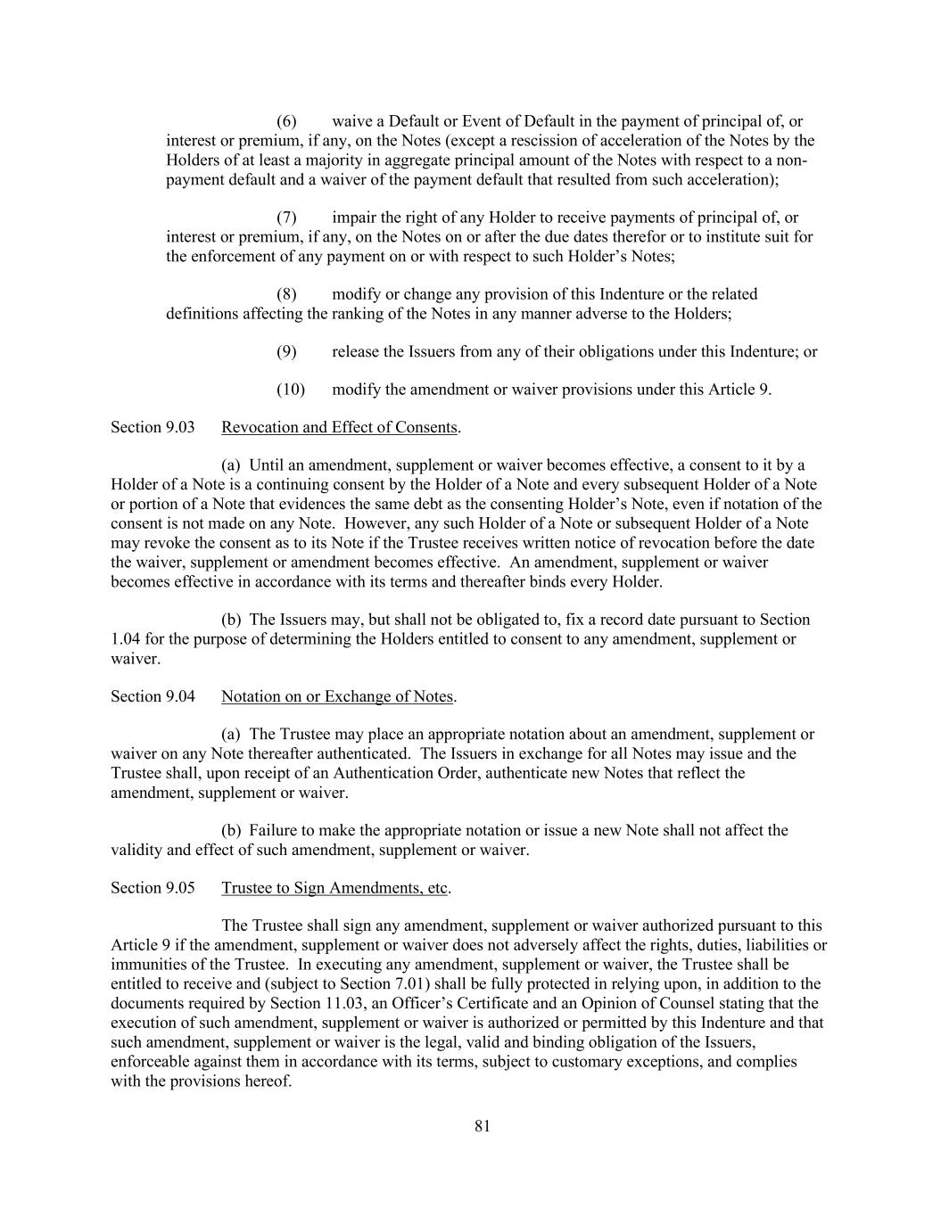 81 (6) waive a Default or Event of Default in the payment of principal of, or interest or premium, if any, on the Notes (except a rescission of acceleration of the Notes by the Holders of at least a majority in aggregate principal amount of the Notes with respect to a non- payment default and a waiver of the payment default that resulted from such acceleration); (7) impair the right of any Holder to receive payments of principal of, or interest or premium, if any, on the Notes on or after the due dates therefor or to institute suit for the enforcement of any payment on or with respect to such Holder’s Notes; (8) modify or change any provision of this Indenture or the related definitions affecting the ranking of the Notes in any manner adverse to the Holders; (9) release the Issuers from any of their obligations under this Indenture; or (10) modify the amendment or waiver provisions under this Article 9. Section 9.03 Revocation and Effect of Consents. (a) Until an amendment, supplement or waiver becomes effective, a consent to it by a Holder of a Note is a continuing consent by the Holder of a Note and every subsequent Holder of a Note or portion of a Note that evidences the same debt as the consenting Holder’s Note, even if notation of the consent is not made on any Note. However, any such Holder of a Note or subsequent Holder of a Note may revoke the consent as to its Note if the Trustee receives written notice of revocation before the date the waiver, supplement or amendment becomes effective. An amendment, supplement or waiver becomes effective in accordance with its terms and thereafter binds every Holder. (b) The Issuers may, but shall not be obligated to, fix a record date pursuant to Section 1.04 for the purpose of determining the Holders entitled to consent to any amendment, supplement or waiver. Section 9.04 Notation on or Exchange of Notes. (a) The Trustee may place an appropriate notation about an amendment, supplement or waiver on any Note thereafter authenticated. The Issuers in exchange for all Notes may issue and the Trustee shall, upon receipt of an Authentication Order, authenticate new Notes that reflect the amendment, supplement or waiver. (b) Failure to make the appropriate notation or issue a new Note shall not affect the validity and effect of such amendment, supplement or waiver. Section 9.05 Trustee to Sign Amendments, etc. The Trustee shall sign any amendment, supplement or waiver authorized pursuant to this Article 9 if the amendment, supplement or waiver does not adversely affect the rights, duties, liabilities or immunities of the Trustee. In executing any amendment, supplement or waiver, the Trustee shall be entitled to receive and (subject to Section 7.01) shall be fully protected in relying upon, in addition to the documents required by Section 11.03, an Officer’s Certificate and an Opinion of Counsel stating that the execution of such amendment, supplement or waiver is authorized or permitted by this Indenture and that such amendment, supplement or waiver is the legal, valid and binding obligation of the Issuers, enforceable against them in accordance with its terms, subject to customary exceptions, and complies with the provisions hereof.