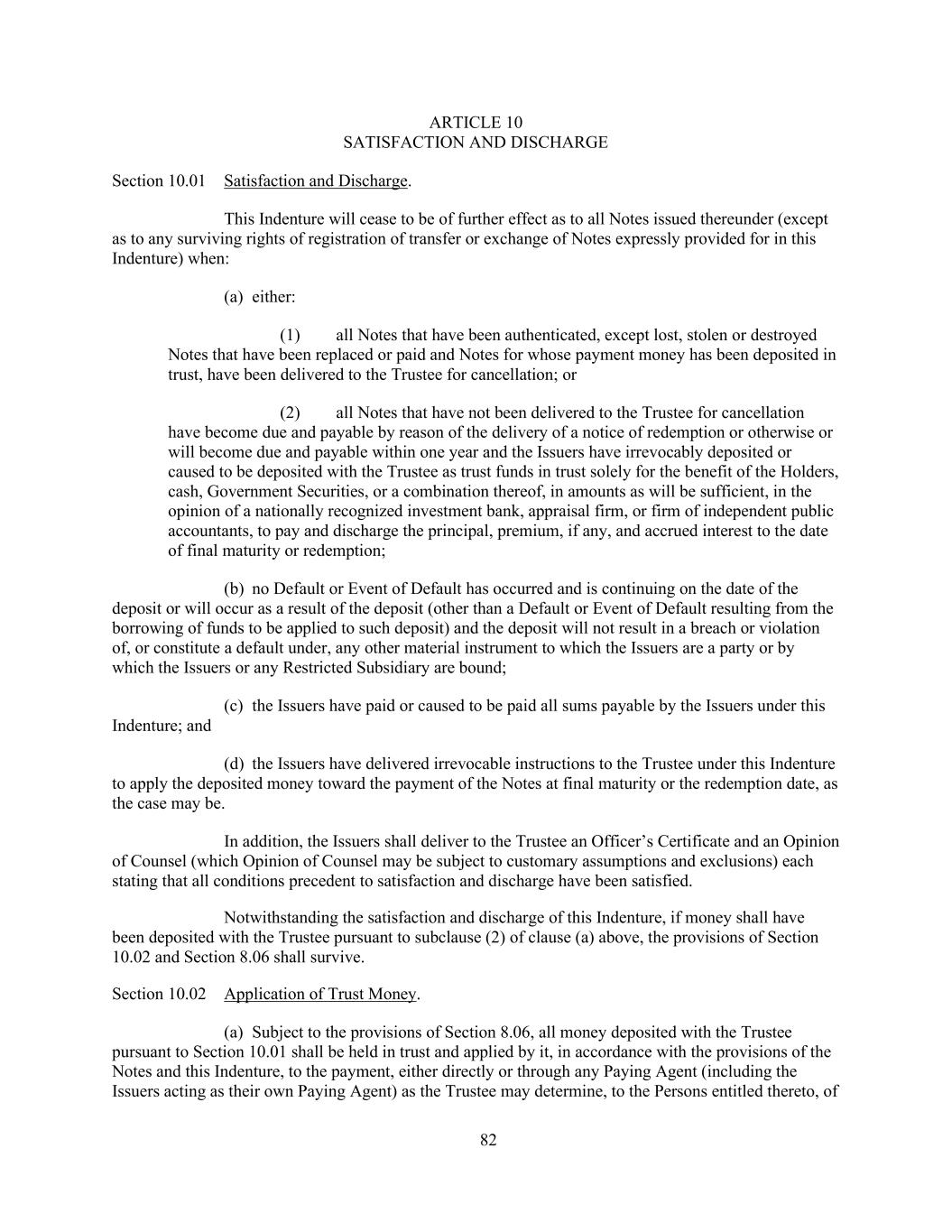 82 ARTICLE 10 SATISFACTION AND DISCHARGE Section 10.01 Satisfaction and Discharge. This Indenture will cease to be of further effect as to all Notes issued thereunder (except as to any surviving rights of registration of transfer or exchange of Notes expressly provided for in this Indenture) when: (a) either: (1) all Notes that have been authenticated, except lost, stolen or destroyed Notes that have been replaced or paid and Notes for whose payment money has been deposited in trust, have been delivered to the Trustee for cancellation; or (2) all Notes that have not been delivered to the Trustee for cancellation have become due and payable by reason of the delivery of a notice of redemption or otherwise or will become due and payable within one year and the Issuers have irrevocably deposited or caused to be deposited with the Trustee as trust funds in trust solely for the benefit of the Holders, cash, Government Securities, or a combination thereof, in amounts as will be sufficient, in the opinion of a nationally recognized investment bank, appraisal firm, or firm of independent public accountants, to pay and discharge the principal, premium, if any, and accrued interest to the date of final maturity or redemption; (b) no Default or Event of Default has occurred and is continuing on the date of the deposit or will occur as a result of the deposit (other than a Default or Event of Default resulting from the borrowing of funds to be applied to such deposit) and the deposit will not result in a breach or violation of, or constitute a default under, any other material instrument to which the Issuers are a party or by which the Issuers or any Restricted Subsidiary are bound; (c) the Issuers have paid or caused to be paid all sums payable by the Issuers under this Indenture; and (d) the Issuers have delivered irrevocable instructions to the Trustee under this Indenture to apply the deposited money toward the payment of the Notes at final maturity or the redemption date, as the case may be. In addition, the Issuers shall deliver to the Trustee an Officer’s Certificate and an Opinion of Counsel (which Opinion of Counsel may be subject to customary assumptions and exclusions) each stating that all conditions precedent to satisfaction and discharge have been satisfied. Notwithstanding the satisfaction and discharge of this Indenture, if money shall have been deposited with the Trustee pursuant to subclause (2) of clause (a) above, the provisions of Section 10.02 and Section 8.06 shall survive. Section 10.02 Application of Trust Money. (a) Subject to the provisions of Section 8.06, all money deposited with the Trustee pursuant to Section 10.01 shall be held in trust and applied by it, in accordance with the provisions of the Notes and this Indenture, to the payment, either directly or through any Paying Agent (including the Issuers acting as their own Paying Agent) as the Trustee may determine, to the Persons entitled thereto, of