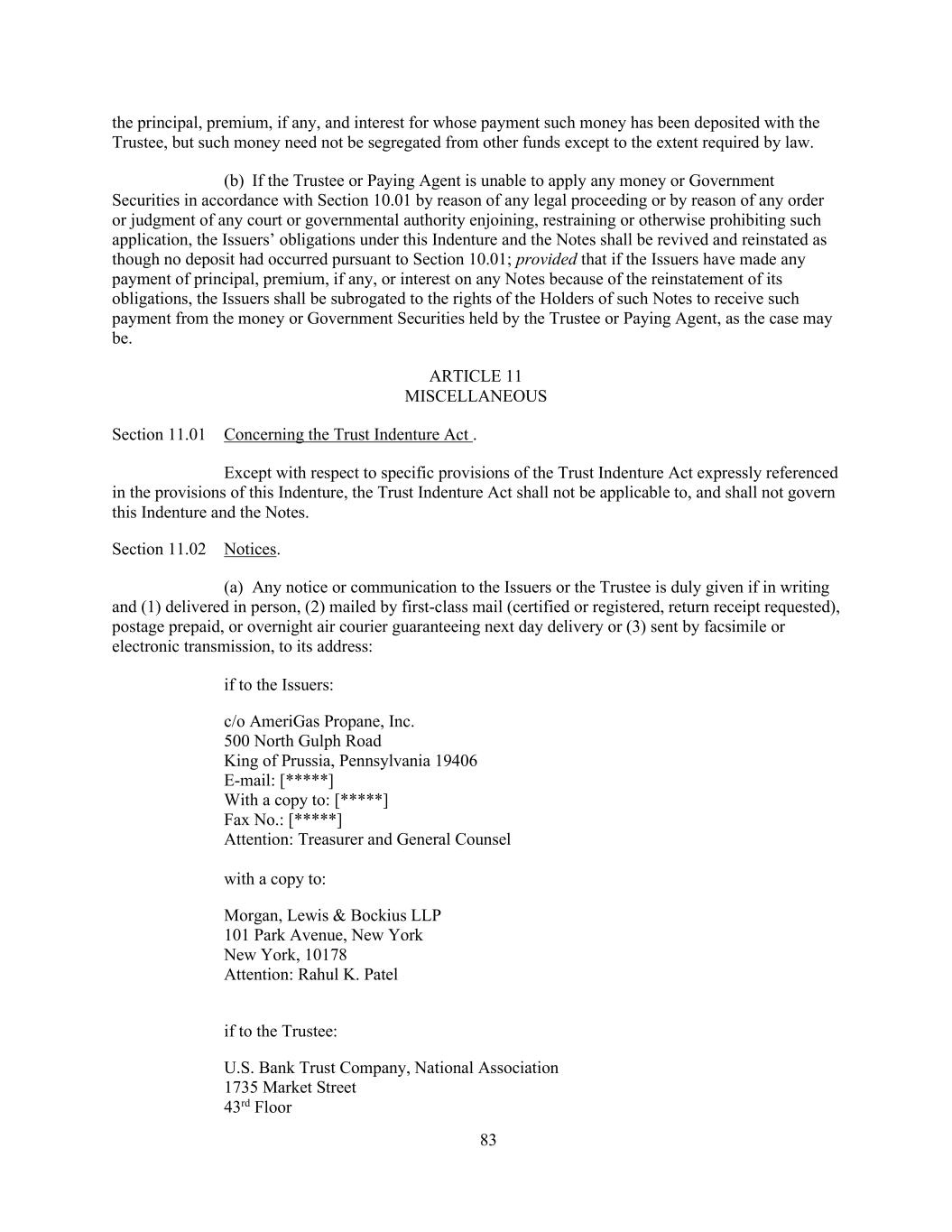 83 the principal, premium, if any, and interest for whose payment such money has been deposited with the Trustee, but such money need not be segregated from other funds except to the extent required by law. (b) If the Trustee or Paying Agent is unable to apply any money or Government Securities in accordance with Section 10.01 by reason of any legal proceeding or by reason of any order or judgment of any court or governmental authority enjoining, restraining or otherwise prohibiting such application, the Issuers’ obligations under this Indenture and the Notes shall be revived and reinstated as though no deposit had occurred pursuant to Section 10.01; provided that if the Issuers have made any payment of principal, premium, if any, or interest on any Notes because of the reinstatement of its obligations, the Issuers shall be subrogated to the rights of the Holders of such Notes to receive such payment from the money or Government Securities held by the Trustee or Paying Agent, as the case may be. ARTICLE 11 MISCELLANEOUS Section 11.01 Concerning the Trust Indenture Act . Except with respect to specific provisions of the Trust Indenture Act expressly referenced in the provisions of this Indenture, the Trust Indenture Act shall not be applicable to, and shall not govern this Indenture and the Notes. Section 11.02 Notices. (a) Any notice or communication to the Issuers or the Trustee is duly given if in writing and (1) delivered in person, (2) mailed by first-class mail (certified or registered, return receipt requested), postage prepaid, or overnight air courier guaranteeing next day delivery or (3) sent by facsimile or electronic transmission, to its address: if to the Issuers: c/o AmeriGas Propane, Inc. 500 North Gulph Road King of Prussia, Pennsylvania 19406 E-mail: [*****] With a copy to: [*****] Fax No.: [*****] Attention: Treasurer and General Counsel with a copy to: Morgan, Lewis & Bockius LLP 101 Park Avenue, New York New York, 10178 Attention: Rahul K. Patel if to the Trustee: U.S. Bank Trust Company, National Association 1735 Market Street 43rd Floor