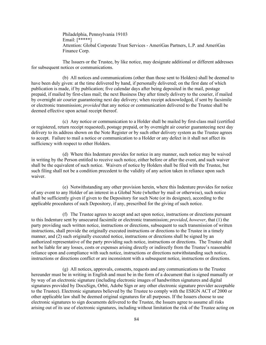 84 Philadelphia, Pennsylvania 19103 Email: [*****] Attention: Global Corporate Trust Services - AmeriGas Partners, L.P. and AmeriGas Finance Corp. The Issuers or the Trustee, by like notice, may designate additional or different addresses for subsequent notices or communications. (b) All notices and communications (other than those sent to Holders) shall be deemed to have been duly given: at the time delivered by hand, if personally delivered; on the first date of which publication is made, if by publication; five calendar days after being deposited in the mail, postage prepaid, if mailed by first-class mail; the next Business Day after timely delivery to the courier, if mailed by overnight air courier guaranteeing next day delivery; when receipt acknowledged, if sent by facsimile or electronic transmission; provided that any notice or communication delivered to the Trustee shall be deemed effective upon actual receipt thereof. (c) Any notice or communication to a Holder shall be mailed by first-class mail (certified or registered, return receipt requested), postage prepaid, or by overnight air courier guaranteeing next day delivery to its address shown on the Note Register or by such other delivery system as the Trustee agrees to accept. Failure to mail a notice or communication to a Holder or any defect in it shall not affect its sufficiency with respect to other Holders. (d) Where this Indenture provides for notice in any manner, such notice may be waived in writing by the Person entitled to receive such notice, either before or after the event, and such waiver shall be the equivalent of such notice. Waivers of notice by Holders shall be filed with the Trustee, but such filing shall not be a condition precedent to the validity of any action taken in reliance upon such waiver. (e) Notwithstanding any other provision herein, where this Indenture provides for notice of any event to any Holder of an interest in a Global Note (whether by mail or otherwise), such notice shall be sufficiently given if given to the Depository for such Note (or its designee), according to the applicable procedures of such Depository, if any, prescribed for the giving of such notice. (f) The Trustee agrees to accept and act upon notice, instructions or directions pursuant to this Indenture sent by unsecured facsimile or electronic transmission; provided, however, that (1) the party providing such written notice, instructions or directions, subsequent to such transmission of written instructions, shall provide the originally executed instructions or directions to the Trustee in a timely manner, and (2) such originally executed notice, instructions or directions shall be signed by an authorized representative of the party providing such notice, instructions or directions. The Trustee shall not be liable for any losses, costs or expenses arising directly or indirectly from the Trustee’s reasonable reliance upon and compliance with such notice, instructions or directions notwithstanding such notice, instructions or directions conflict or are inconsistent with a subsequent notice, instructions or directions. (g) All notices, approvals, consents, requests and any communications to the Trustee hereunder must be in writing in English and must be in the form of a document that is signed manually or by way of an electronic signature (including electronic images of handwritten signatures and digital signatures provided by DocuSign, Orbit, Adobe Sign or any other electronic signature provider acceptable to the Trustee). Electronic signatures believed by the Trustee to comply with the ESIGN ACT of 2000 or other applicable law shall be deemed original signatures for all purposes. If the Issuers choose to use electronic signatures to sign documents delivered to the Trustee, the Issuers agree to assume all risks arising out of its use of electronic signatures, including without limitation the risk of the Trustee acting on