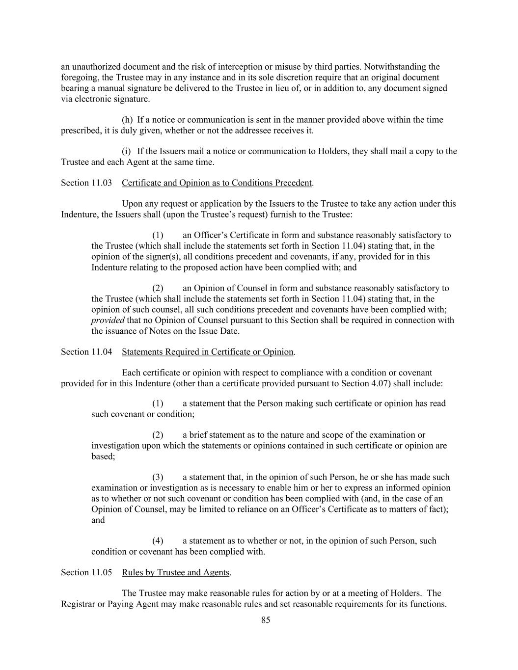 85 an unauthorized document and the risk of interception or misuse by third parties. Notwithstanding the foregoing, the Trustee may in any instance and in its sole discretion require that an original document bearing a manual signature be delivered to the Trustee in lieu of, or in addition to, any document signed via electronic signature. (h) If a notice or communication is sent in the manner provided above within the time prescribed, it is duly given, whether or not the addressee receives it. (i) If the Issuers mail a notice or communication to Holders, they shall mail a copy to the Trustee and each Agent at the same time. Section 11.03 Certificate and Opinion as to Conditions Precedent. Upon any request or application by the Issuers to the Trustee to take any action under this Indenture, the Issuers shall (upon the Trustee’s request) furnish to the Trustee: (1) an Officer’s Certificate in form and substance reasonably satisfactory to the Trustee (which shall include the statements set forth in Section 11.04) stating that, in the opinion of the signer(s), all conditions precedent and covenants, if any, provided for in this Indenture relating to the proposed action have been complied with; and (2) an Opinion of Counsel in form and substance reasonably satisfactory to the Trustee (which shall include the statements set forth in Section 11.04) stating that, in the opinion of such counsel, all such conditions precedent and covenants have been complied with; provided that no Opinion of Counsel pursuant to this Section shall be required in connection with the issuance of Notes on the Issue Date. Section 11.04 Statements Required in Certificate or Opinion. Each certificate or opinion with respect to compliance with a condition or covenant provided for in this Indenture (other than a certificate provided pursuant to Section 4.07) shall include: (1) a statement that the Person making such certificate or opinion has read such covenant or condition; (2) a brief statement as to the nature and scope of the examination or investigation upon which the statements or opinions contained in such certificate or opinion are based; (3) a statement that, in the opinion of such Person, he or she has made such examination or investigation as is necessary to enable him or her to express an informed opinion as to whether or not such covenant or condition has been complied with (and, in the case of an Opinion of Counsel, may be limited to reliance on an Officer’s Certificate as to matters of fact); and (4) a statement as to whether or not, in the opinion of such Person, such condition or covenant has been complied with. Section 11.05 Rules by Trustee and Agents. The Trustee may make reasonable rules for action by or at a meeting of Holders. The Registrar or Paying Agent may make reasonable rules and set reasonable requirements for its functions.