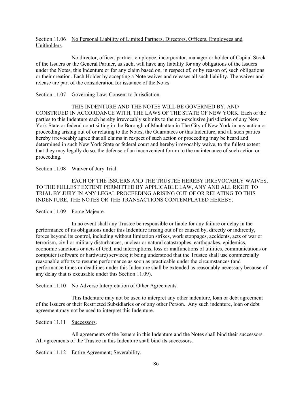 86 Section 11.06 No Personal Liability of Limited Partners, Directors, Officers, Employees and Unitholders. No director, officer, partner, employee, incorporator, manager or holder of Capital Stock of the Issuers or the General Partner, as such, will have any liability for any obligations of the Issuers under the Notes, this Indenture or for any claim based on, in respect of, or by reason of, such obligations or their creation. Each Holder by accepting a Note waives and releases all such liability. The waiver and release are part of the consideration for issuance of the Notes. Section 11.07 Governing Law; Consent to Jurisdiction. THIS INDENTURE AND THE NOTES WILL BE GOVERNED BY, AND CONSTRUED IN ACCORDANCE WITH, THE LAWS OF THE STATE OF NEW YORK. Each of the parties to this Indenture each hereby irrevocably submits to the non-exclusive jurisdiction of any New York State or federal court sitting in the Borough of Manhattan in The City of New York in any action or proceeding arising out of or relating to the Notes, the Guarantees or this Indenture, and all such parties hereby irrevocably agree that all claims in respect of such action or proceeding may be heard and determined in such New York State or federal court and hereby irrevocably waive, to the fullest extent that they may legally do so, the defense of an inconvenient forum to the maintenance of such action or proceeding. Section 11.08 Waiver of Jury Trial. EACH OF THE ISSUERS AND THE TRUSTEE HEREBY IRREVOCABLY WAIVES, TO THE FULLEST EXTENT PERMITTED BY APPLICABLE LAW, ANY AND ALL RIGHT TO TRIAL BY JURY IN ANY LEGAL PROCEEDING ARISING OUT OF OR RELATING TO THIS INDENTURE, THE NOTES OR THE TRANSACTIONS CONTEMPLATED HEREBY. Section 11.09 Force Majeure. In no event shall any Trustee be responsible or liable for any failure or delay in the performance of its obligations under this Indenture arising out of or caused by, directly or indirectly, forces beyond its control, including without limitation strikes, work stoppages, accidents, acts of war or terrorism, civil or military disturbances, nuclear or natural catastrophes, earthquakes, epidemics, economic sanctions or acts of God, and interruptions, loss or malfunctions of utilities, communications or computer (software or hardware) services; it being understood that the Trustee shall use commercially reasonable efforts to resume performance as soon as practicable under the circumstances (and performance times or deadlines under this Indenture shall be extended as reasonably necessary because of any delay that is excusable under this Section 11.09). Section 11.10 No Adverse Interpretation of Other Agreements. This Indenture may not be used to interpret any other indenture, loan or debt agreement of the Issuers or their Restricted Subsidiaries or of any other Person. Any such indenture, loan or debt agreement may not be used to interpret this Indenture. Section 11.11 Successors. All agreements of the Issuers in this Indenture and the Notes shall bind their successors. All agreements of the Trustee in this Indenture shall bind its successors. Section 11.12 Entire Agreement; Severability.
