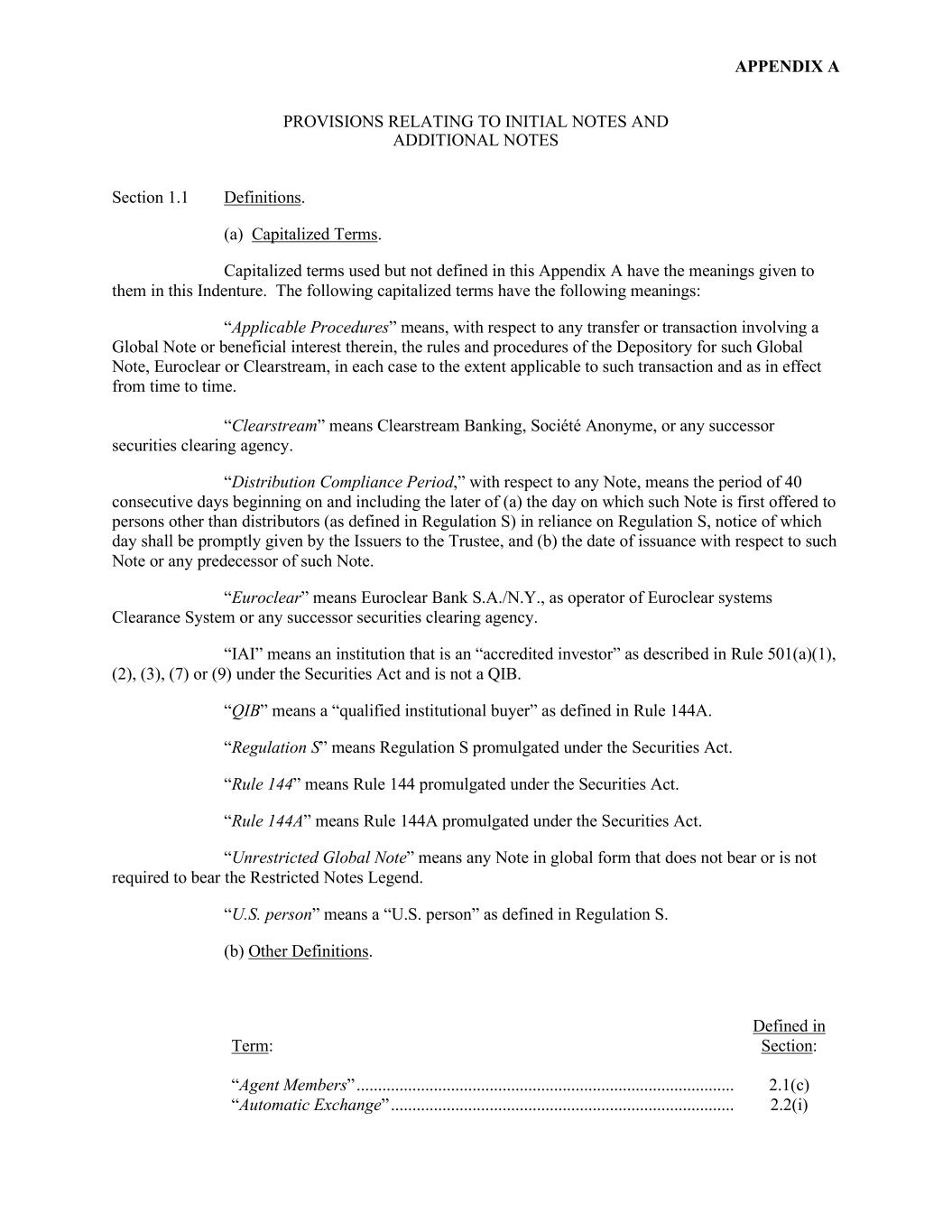 APPENDIX A PROVISIONS RELATING TO INITIAL NOTES AND ADDITIONAL NOTES Section 1.1 Definitions. (a) Capitalized Terms. Capitalized terms used but not defined in this Appendix A have the meanings given to them in this Indenture. The following capitalized terms have the following meanings: “Applicable Procedures” means, with respect to any transfer or transaction involving a Global Note or beneficial interest therein, the rules and procedures of the Depository for such Global Note, Euroclear or Clearstream, in each case to the extent applicable to such transaction and as in effect from time to time. “Clearstream” means Clearstream Banking, Société Anonyme, or any successor securities clearing agency. “Distribution Compliance Period,” with respect to any Note, means the period of 40 consecutive days beginning on and including the later of (a) the day on which such Note is first offered to persons other than distributors (as defined in Regulation S) in reliance on Regulation S, notice of which day shall be promptly given by the Issuers to the Trustee, and (b) the date of issuance with respect to such Note or any predecessor of such Note. “Euroclear” means Euroclear Bank S.A./N.Y., as operator of Euroclear systems Clearance System or any successor securities clearing agency. “IAI” means an institution that is an “accredited investor” as described in Rule 501(a)(1), (2), (3), (7) or (9) under the Securities Act and is not a QIB. “QIB” means a “qualified institutional buyer” as defined in Rule 144A. “Regulation S” means Regulation S promulgated under the Securities Act. “Rule 144” means Rule 144 promulgated under the Securities Act. “Rule 144A” means Rule 144A promulgated under the Securities Act. “Unrestricted Global Note” means any Note in global form that does not bear or is not required to bear the Restricted Notes Legend. “U.S. person” means a “U.S. person” as defined in Regulation S. (b) Other Definitions. Term: Defined in Section: “Agent Members” ........................................................................................ 2.1(c) “Automatic Exchange” ................................................................................ 2.2(i)
