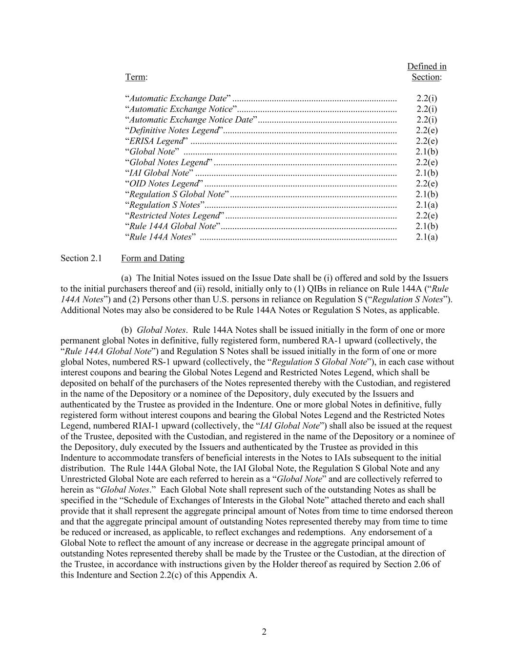 2 Term: Defined in Section: “Automatic Exchange Date” ....................................................................... 2.2(i) “Automatic Exchange Notice” ..................................................................... 2.2(i) “Automatic Exchange Notice Date” ............................................................ 2.2(i) “Definitive Notes Legend” ........................................................................... 2.2(e) “ERISA Legend” ......................................................................................... 2.2(e) “Global Note” ............................................................................................ 2.1(b) “Global Notes Legend” ............................................................................... 2.2(e) “IAI Global Note” ....................................................................................... 2.1(b) “OID Notes Legend” ................................................................................... 2.2(e) “Regulation S Global Note” ........................................................................ 2.1(b) “Regulation S Notes”................................................................................... 2.1(a) “Restricted Notes Legend” .......................................................................... 2.2(e) “Rule 144A Global Note” ............................................................................ 2.1(b) “Rule 144A Notes” ..................................................................................... 2.1(a) Section 2.1 Form and Dating (a) The Initial Notes issued on the Issue Date shall be (i) offered and sold by the Issuers to the initial purchasers thereof and (ii) resold, initially only to (1) QIBs in reliance on Rule 144A (“Rule 144A Notes”) and (2) Persons other than U.S. persons in reliance on Regulation S (“Regulation S Notes”). Additional Notes may also be considered to be Rule 144A Notes or Regulation S Notes, as applicable. (b) Global Notes. Rule 144A Notes shall be issued initially in the form of one or more permanent global Notes in definitive, fully registered form, numbered RA-1 upward (collectively, the “Rule 144A Global Note”) and Regulation S Notes shall be issued initially in the form of one or more global Notes, numbered RS-1 upward (collectively, the “Regulation S Global Note”), in each case without interest coupons and bearing the Global Notes Legend and Restricted Notes Legend, which shall be deposited on behalf of the purchasers of the Notes represented thereby with the Custodian, and registered in the name of the Depository or a nominee of the Depository, duly executed by the Issuers and authenticated by the Trustee as provided in the Indenture. One or more global Notes in definitive, fully registered form without interest coupons and bearing the Global Notes Legend and the Restricted Notes Legend, numbered RIAI-1 upward (collectively, the “IAI Global Note”) shall also be issued at the request of the Trustee, deposited with the Custodian, and registered in the name of the Depository or a nominee of the Depository, duly executed by the Issuers and authenticated by the Trustee as provided in this Indenture to accommodate transfers of beneficial interests in the Notes to IAIs subsequent to the initial distribution. The Rule 144A Global Note, the IAI Global Note, the Regulation S Global Note and any Unrestricted Global Note are each referred to herein as a “Global Note” and are collectively referred to herein as “Global Notes.” Each Global Note shall represent such of the outstanding Notes as shall be specified in the “Schedule of Exchanges of Interests in the Global Note” attached thereto and each shall provide that it shall represent the aggregate principal amount of Notes from time to time endorsed thereon and that the aggregate principal amount of outstanding Notes represented thereby may from time to time be reduced or increased, as applicable, to reflect exchanges and redemptions. Any endorsement of a Global Note to reflect the amount of any increase or decrease in the aggregate principal amount of outstanding Notes represented thereby shall be made by the Trustee or the Custodian, at the direction of the Trustee, in accordance with instructions given by the Holder thereof as required by Section 2.06 of this Indenture and Section 2.2(c) of this Appendix A.