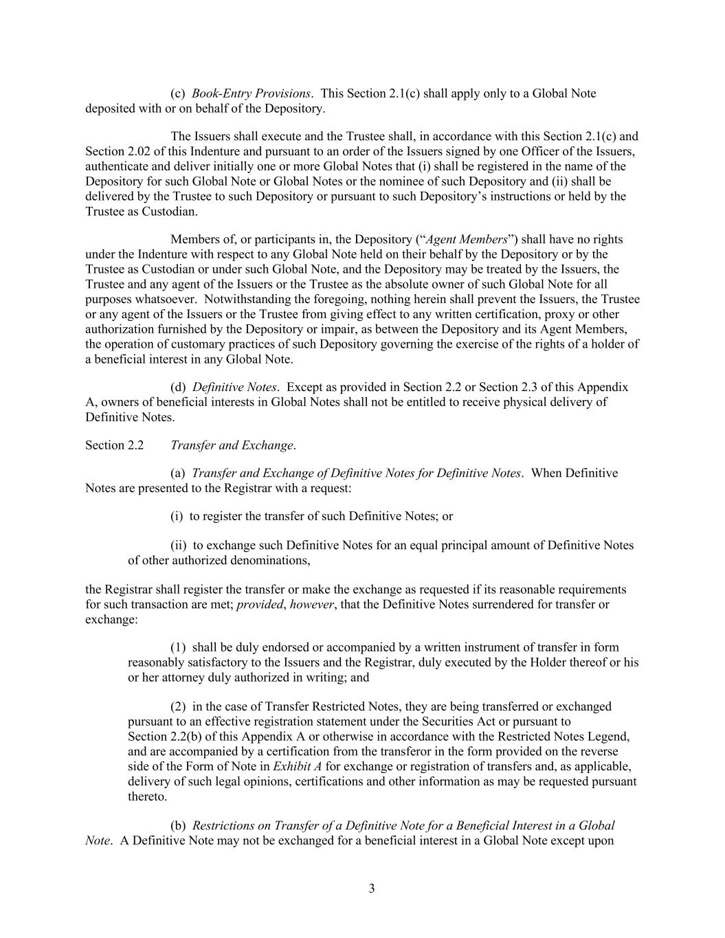 3 (c) Book-Entry Provisions. This Section 2.1(c) shall apply only to a Global Note deposited with or on behalf of the Depository. The Issuers shall execute and the Trustee shall, in accordance with this Section 2.1(c) and Section 2.02 of this Indenture and pursuant to an order of the Issuers signed by one Officer of the Issuers, authenticate and deliver initially one or more Global Notes that (i) shall be registered in the name of the Depository for such Global Note or Global Notes or the nominee of such Depository and (ii) shall be delivered by the Trustee to such Depository or pursuant to such Depository’s instructions or held by the Trustee as Custodian. Members of, or participants in, the Depository (“Agent Members”) shall have no rights under the Indenture with respect to any Global Note held on their behalf by the Depository or by the Trustee as Custodian or under such Global Note, and the Depository may be treated by the Issuers, the Trustee and any agent of the Issuers or the Trustee as the absolute owner of such Global Note for all purposes whatsoever. Notwithstanding the foregoing, nothing herein shall prevent the Issuers, the Trustee or any agent of the Issuers or the Trustee from giving effect to any written certification, proxy or other authorization furnished by the Depository or impair, as between the Depository and its Agent Members, the operation of customary practices of such Depository governing the exercise of the rights of a holder of a beneficial interest in any Global Note. (d) Definitive Notes. Except as provided in Section 2.2 or Section 2.3 of this Appendix A, owners of beneficial interests in Global Notes shall not be entitled to receive physical delivery of Definitive Notes. Section 2.2 Transfer and Exchange. (a) Transfer and Exchange of Definitive Notes for Definitive Notes. When Definitive Notes are presented to the Registrar with a request: (i) to register the transfer of such Definitive Notes; or (ii) to exchange such Definitive Notes for an equal principal amount of Definitive Notes of other authorized denominations, the Registrar shall register the transfer or make the exchange as requested if its reasonable requirements for such transaction are met; provided, however, that the Definitive Notes surrendered for transfer or exchange: (1) shall be duly endorsed or accompanied by a written instrument of transfer in form reasonably satisfactory to the Issuers and the Registrar, duly executed by the Holder thereof or his or her attorney duly authorized in writing; and (2) in the case of Transfer Restricted Notes, they are being transferred or exchanged pursuant to an effective registration statement under the Securities Act or pursuant to Section 2.2(b) of this Appendix A or otherwise in accordance with the Restricted Notes Legend, and are accompanied by a certification from the transferor in the form provided on the reverse side of the Form of Note in Exhibit A for exchange or registration of transfers and, as applicable, delivery of such legal opinions, certifications and other information as may be requested pursuant thereto. (b) Restrictions on Transfer of a Definitive Note for a Beneficial Interest in a Global Note. A Definitive Note may not be exchanged for a beneficial interest in a Global Note except upon
