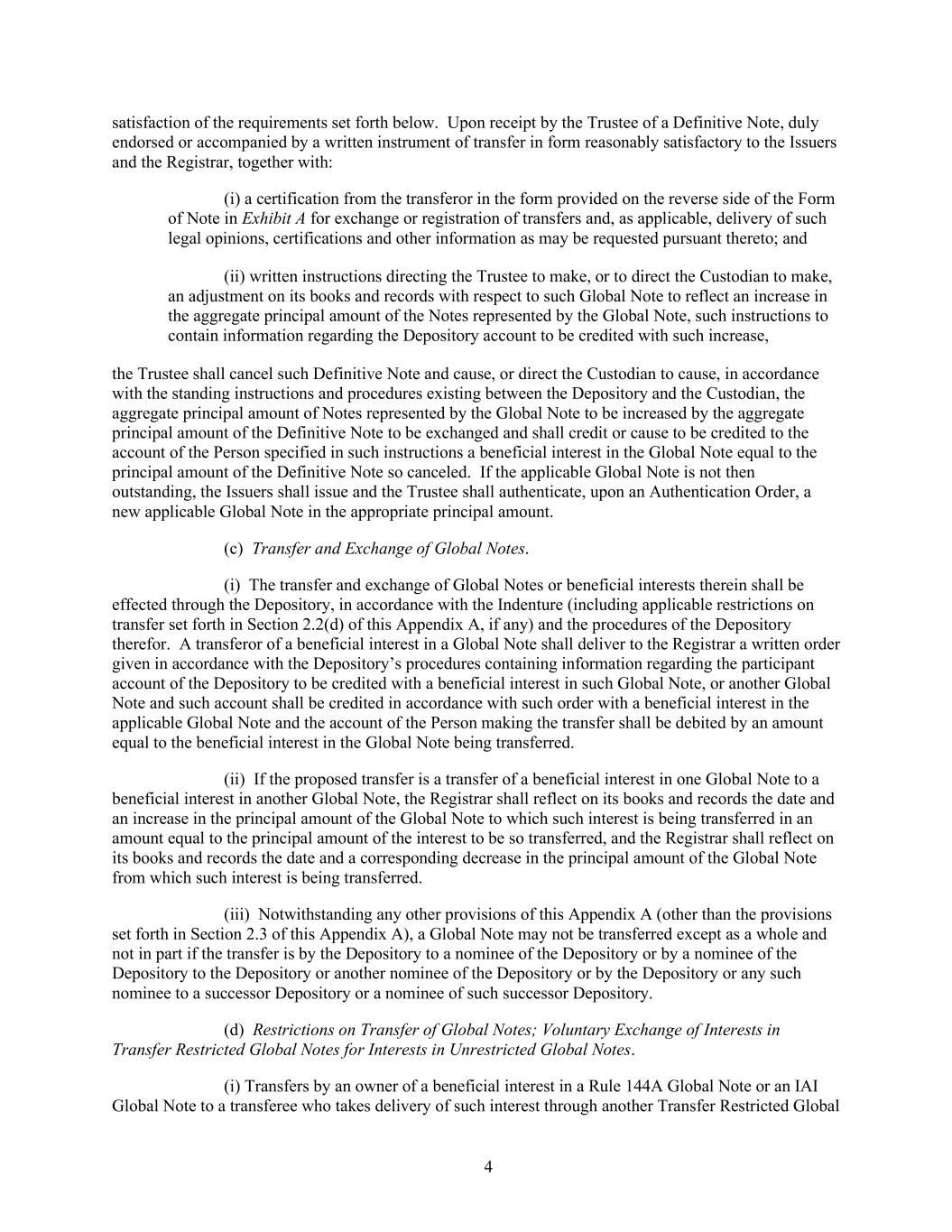 4 satisfaction of the requirements set forth below. Upon receipt by the Trustee of a Definitive Note, duly endorsed or accompanied by a written instrument of transfer in form reasonably satisfactory to the Issuers and the Registrar, together with: (i) a certification from the transferor in the form provided on the reverse side of the Form of Note in Exhibit A for exchange or registration of transfers and, as applicable, delivery of such legal opinions, certifications and other information as may be requested pursuant thereto; and (ii) written instructions directing the Trustee to make, or to direct the Custodian to make, an adjustment on its books and records with respect to such Global Note to reflect an increase in the aggregate principal amount of the Notes represented by the Global Note, such instructions to contain information regarding the Depository account to be credited with such increase, the Trustee shall cancel such Definitive Note and cause, or direct the Custodian to cause, in accordance with the standing instructions and procedures existing between the Depository and the Custodian, the aggregate principal amount of Notes represented by the Global Note to be increased by the aggregate principal amount of the Definitive Note to be exchanged and shall credit or cause to be credited to the account of the Person specified in such instructions a beneficial interest in the Global Note equal to the principal amount of the Definitive Note so canceled. If the applicable Global Note is not then outstanding, the Issuers shall issue and the Trustee shall authenticate, upon an Authentication Order, a new applicable Global Note in the appropriate principal amount. (c) Transfer and Exchange of Global Notes. (i) The transfer and exchange of Global Notes or beneficial interests therein shall be effected through the Depository, in accordance with the Indenture (including applicable restrictions on transfer set forth in Section 2.2(d) of this Appendix A, if any) and the procedures of the Depository therefor. A transferor of a beneficial interest in a Global Note shall deliver to the Registrar a written order given in accordance with the Depository’s procedures containing information regarding the participant account of the Depository to be credited with a beneficial interest in such Global Note, or another Global Note and such account shall be credited in accordance with such order with a beneficial interest in the applicable Global Note and the account of the Person making the transfer shall be debited by an amount equal to the beneficial interest in the Global Note being transferred. (ii) If the proposed transfer is a transfer of a beneficial interest in one Global Note to a beneficial interest in another Global Note, the Registrar shall reflect on its books and records the date and an increase in the principal amount of the Global Note to which such interest is being transferred in an amount equal to the principal amount of the interest to be so transferred, and the Registrar shall reflect on its books and records the date and a corresponding decrease in the principal amount of the Global Note from which such interest is being transferred. (iii) Notwithstanding any other provisions of this Appendix A (other than the provisions set forth in Section 2.3 of this Appendix A), a Global Note may not be transferred except as a whole and not in part if the transfer is by the Depository to a nominee of the Depository or by a nominee of the Depository to the Depository or another nominee of the Depository or by the Depository or any such nominee to a successor Depository or a nominee of such successor Depository. (d) Restrictions on Transfer of Global Notes; Voluntary Exchange of Interests in Transfer Restricted Global Notes for Interests in Unrestricted Global Notes. (i) Transfers by an owner of a beneficial interest in a Rule 144A Global Note or an IAI Global Note to a transferee who takes delivery of such interest through another Transfer Restricted Global