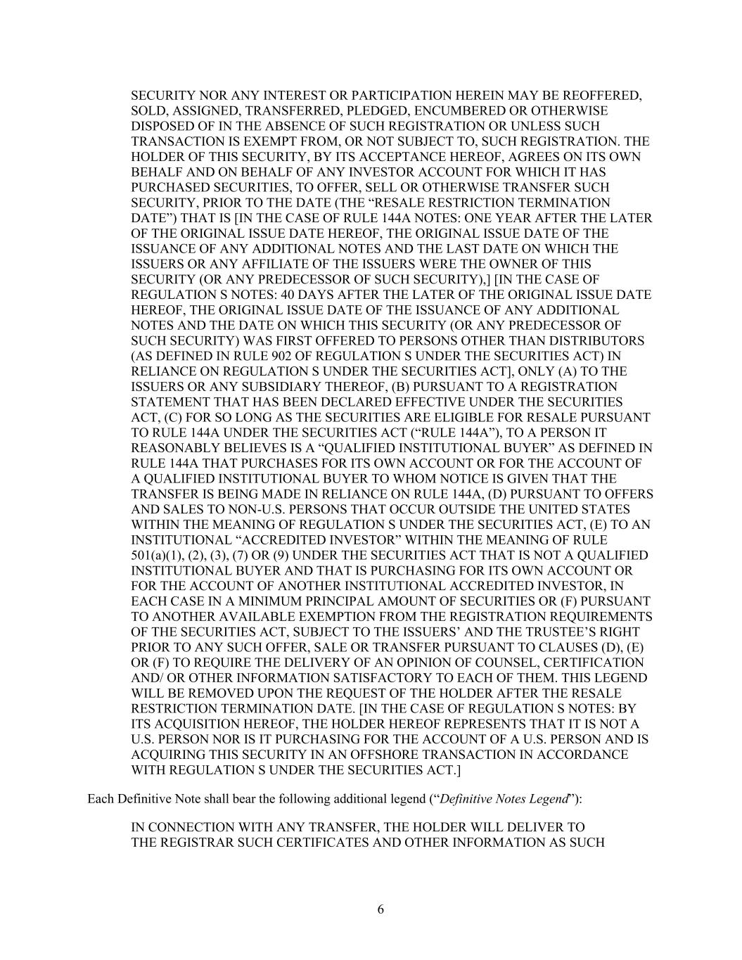6 SECURITY NOR ANY INTEREST OR PARTICIPATION HEREIN MAY BE REOFFERED, SOLD, ASSIGNED, TRANSFERRED, PLEDGED, ENCUMBERED OR OTHERWISE DISPOSED OF IN THE ABSENCE OF SUCH REGISTRATION OR UNLESS SUCH TRANSACTION IS EXEMPT FROM, OR NOT SUBJECT TO, SUCH REGISTRATION. THE HOLDER OF THIS SECURITY, BY ITS ACCEPTANCE HEREOF, AGREES ON ITS OWN BEHALF AND ON BEHALF OF ANY INVESTOR ACCOUNT FOR WHICH IT HAS PURCHASED SECURITIES, TO OFFER, SELL OR OTHERWISE TRANSFER SUCH SECURITY, PRIOR TO THE DATE (THE “RESALE RESTRICTION TERMINATION DATE”) THAT IS [IN THE CASE OF RULE 144A NOTES: ONE YEAR AFTER THE LATER OF THE ORIGINAL ISSUE DATE HEREOF, THE ORIGINAL ISSUE DATE OF THE ISSUANCE OF ANY ADDITIONAL NOTES AND THE LAST DATE ON WHICH THE ISSUERS OR ANY AFFILIATE OF THE ISSUERS WERE THE OWNER OF THIS SECURITY (OR ANY PREDECESSOR OF SUCH SECURITY),] [IN THE CASE OF REGULATION S NOTES: 40 DAYS AFTER THE LATER OF THE ORIGINAL ISSUE DATE HEREOF, THE ORIGINAL ISSUE DATE OF THE ISSUANCE OF ANY ADDITIONAL NOTES AND THE DATE ON WHICH THIS SECURITY (OR ANY PREDECESSOR OF SUCH SECURITY) WAS FIRST OFFERED TO PERSONS OTHER THAN DISTRIBUTORS (AS DEFINED IN RULE 902 OF REGULATION S UNDER THE SECURITIES ACT) IN RELIANCE ON REGULATION S UNDER THE SECURITIES ACT], ONLY (A) TO THE ISSUERS OR ANY SUBSIDIARY THEREOF, (B) PURSUANT TO A REGISTRATION STATEMENT THAT HAS BEEN DECLARED EFFECTIVE UNDER THE SECURITIES ACT, (C) FOR SO LONG AS THE SECURITIES ARE ELIGIBLE FOR RESALE PURSUANT TO RULE 144A UNDER THE SECURITIES ACT (“RULE 144A”), TO A PERSON IT REASONABLY BELIEVES IS A “QUALIFIED INSTITUTIONAL BUYER” AS DEFINED IN RULE 144A THAT PURCHASES FOR ITS OWN ACCOUNT OR FOR THE ACCOUNT OF A QUALIFIED INSTITUTIONAL BUYER TO WHOM NOTICE IS GIVEN THAT THE TRANSFER IS BEING MADE IN RELIANCE ON RULE 144A, (D) PURSUANT TO OFFERS AND SALES TO NON-U.S. PERSONS THAT OCCUR OUTSIDE THE UNITED STATES WITHIN THE MEANING OF REGULATION S UNDER THE SECURITIES ACT, (E) TO AN INSTITUTIONAL “ACCREDITED INVESTOR” WITHIN THE MEANING OF RULE 501(a)(1), (2), (3), (7) OR (9) UNDER THE SECURITIES ACT THAT IS NOT A QUALIFIED INSTITUTIONAL BUYER AND THAT IS PURCHASING FOR ITS OWN ACCOUNT OR FOR THE ACCOUNT OF ANOTHER INSTITUTIONAL ACCREDITED INVESTOR, IN EACH CASE IN A MINIMUM PRINCIPAL AMOUNT OF SECURITIES OR (F) PURSUANT TO ANOTHER AVAILABLE EXEMPTION FROM THE REGISTRATION REQUIREMENTS OF THE SECURITIES ACT, SUBJECT TO THE ISSUERS’ AND THE TRUSTEE’S RIGHT PRIOR TO ANY SUCH OFFER, SALE OR TRANSFER PURSUANT TO CLAUSES (D), (E) OR (F) TO REQUIRE THE DELIVERY OF AN OPINION OF COUNSEL, CERTIFICATION AND/ OR OTHER INFORMATION SATISFACTORY TO EACH OF THEM. THIS LEGEND WILL BE REMOVED UPON THE REQUEST OF THE HOLDER AFTER THE RESALE RESTRICTION TERMINATION DATE. [IN THE CASE OF REGULATION S NOTES: BY ITS ACQUISITION HEREOF, THE HOLDER HEREOF REPRESENTS THAT IT IS NOT A U.S. PERSON NOR IS IT PURCHASING FOR THE ACCOUNT OF A U.S. PERSON AND IS ACQUIRING THIS SECURITY IN AN OFFSHORE TRANSACTION IN ACCORDANCE WITH REGULATION S UNDER THE SECURITIES ACT.] Each Definitive Note shall bear the following additional legend (“Definitive Notes Legend”): IN CONNECTION WITH ANY TRANSFER, THE HOLDER WILL DELIVER TO THE REGISTRAR SUCH CERTIFICATES AND OTHER INFORMATION AS SUCH