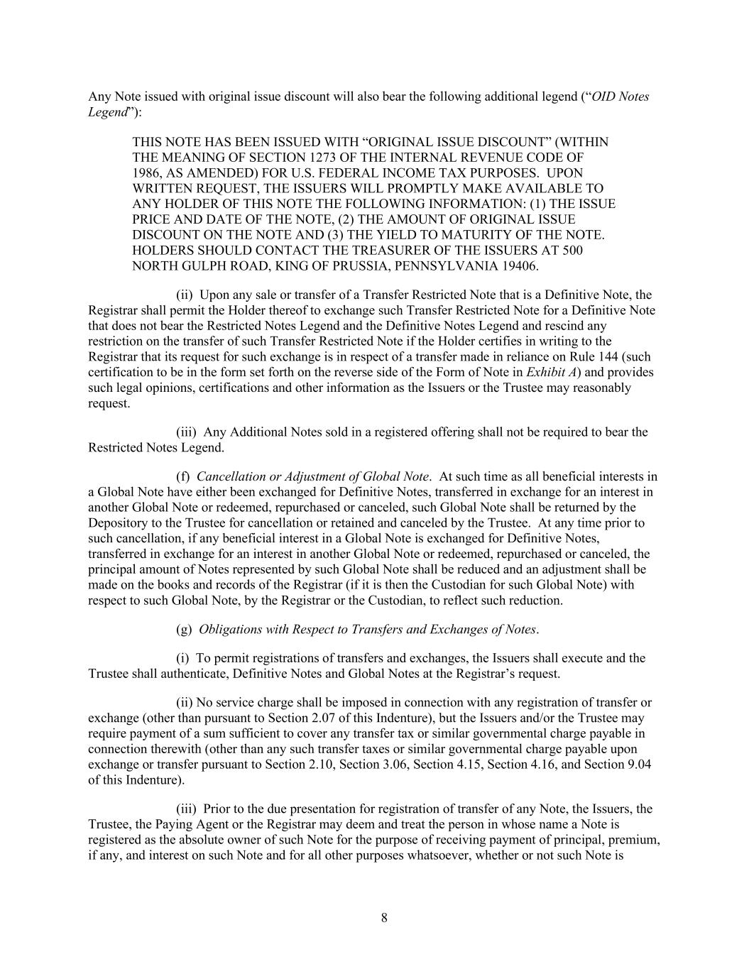 8 Any Note issued with original issue discount will also bear the following additional legend (“OID Notes Legend”): THIS NOTE HAS BEEN ISSUED WITH “ORIGINAL ISSUE DISCOUNT” (WITHIN THE MEANING OF SECTION 1273 OF THE INTERNAL REVENUE CODE OF 1986, AS AMENDED) FOR U.S. FEDERAL INCOME TAX PURPOSES. UPON WRITTEN REQUEST, THE ISSUERS WILL PROMPTLY MAKE AVAILABLE TO ANY HOLDER OF THIS NOTE THE FOLLOWING INFORMATION: (1) THE ISSUE PRICE AND DATE OF THE NOTE, (2) THE AMOUNT OF ORIGINAL ISSUE DISCOUNT ON THE NOTE AND (3) THE YIELD TO MATURITY OF THE NOTE. HOLDERS SHOULD CONTACT THE TREASURER OF THE ISSUERS AT 500 NORTH GULPH ROAD, KING OF PRUSSIA, PENNSYLVANIA 19406. (ii) Upon any sale or transfer of a Transfer Restricted Note that is a Definitive Note, the Registrar shall permit the Holder thereof to exchange such Transfer Restricted Note for a Definitive Note that does not bear the Restricted Notes Legend and the Definitive Notes Legend and rescind any restriction on the transfer of such Transfer Restricted Note if the Holder certifies in writing to the Registrar that its request for such exchange is in respect of a transfer made in reliance on Rule 144 (such certification to be in the form set forth on the reverse side of the Form of Note in Exhibit A) and provides such legal opinions, certifications and other information as the Issuers or the Trustee may reasonably request. (iii) Any Additional Notes sold in a registered offering shall not be required to bear the Restricted Notes Legend. (f) Cancellation or Adjustment of Global Note. At such time as all beneficial interests in a Global Note have either been exchanged for Definitive Notes, transferred in exchange for an interest in another Global Note or redeemed, repurchased or canceled, such Global Note shall be returned by the Depository to the Trustee for cancellation or retained and canceled by the Trustee. At any time prior to such cancellation, if any beneficial interest in a Global Note is exchanged for Definitive Notes, transferred in exchange for an interest in another Global Note or redeemed, repurchased or canceled, the principal amount of Notes represented by such Global Note shall be reduced and an adjustment shall be made on the books and records of the Registrar (if it is then the Custodian for such Global Note) with respect to such Global Note, by the Registrar or the Custodian, to reflect such reduction. (g) Obligations with Respect to Transfers and Exchanges of Notes. (i) To permit registrations of transfers and exchanges, the Issuers shall execute and the Trustee shall authenticate, Definitive Notes and Global Notes at the Registrar’s request. (ii) No service charge shall be imposed in connection with any registration of transfer or exchange (other than pursuant to Section 2.07 of this Indenture), but the Issuers and/or the Trustee may require payment of a sum sufficient to cover any transfer tax or similar governmental charge payable in connection therewith (other than any such transfer taxes or similar governmental charge payable upon exchange or transfer pursuant to Section 2.10, Section 3.06, Section 4.15, Section 4.16, and Section 9.04 of this Indenture). (iii) Prior to the due presentation for registration of transfer of any Note, the Issuers, the Trustee, the Paying Agent or the Registrar may deem and treat the person in whose name a Note is registered as the absolute owner of such Note for the purpose of receiving payment of principal, premium, if any, and interest on such Note and for all other purposes whatsoever, whether or not such Note is