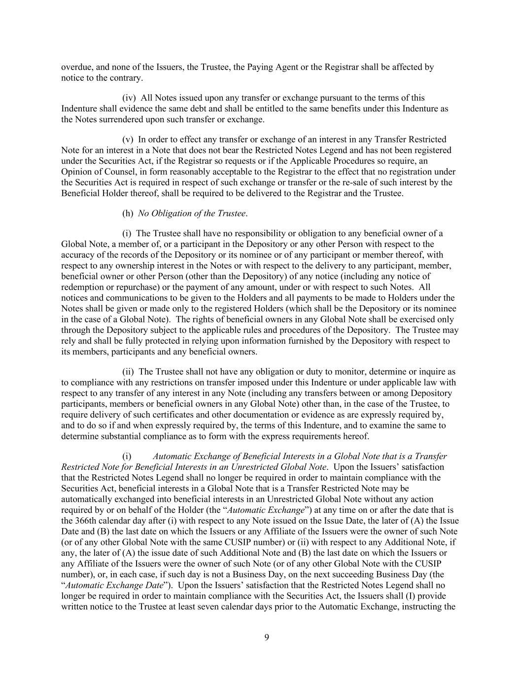9 overdue, and none of the Issuers, the Trustee, the Paying Agent or the Registrar shall be affected by notice to the contrary. (iv) All Notes issued upon any transfer or exchange pursuant to the terms of this Indenture shall evidence the same debt and shall be entitled to the same benefits under this Indenture as the Notes surrendered upon such transfer or exchange. (v) In order to effect any transfer or exchange of an interest in any Transfer Restricted Note for an interest in a Note that does not bear the Restricted Notes Legend and has not been registered under the Securities Act, if the Registrar so requests or if the Applicable Procedures so require, an Opinion of Counsel, in form reasonably acceptable to the Registrar to the effect that no registration under the Securities Act is required in respect of such exchange or transfer or the re-sale of such interest by the Beneficial Holder thereof, shall be required to be delivered to the Registrar and the Trustee. (h) No Obligation of the Trustee. (i) The Trustee shall have no responsibility or obligation to any beneficial owner of a Global Note, a member of, or a participant in the Depository or any other Person with respect to the accuracy of the records of the Depository or its nominee or of any participant or member thereof, with respect to any ownership interest in the Notes or with respect to the delivery to any participant, member, beneficial owner or other Person (other than the Depository) of any notice (including any notice of redemption or repurchase) or the payment of any amount, under or with respect to such Notes. All notices and communications to be given to the Holders and all payments to be made to Holders under the Notes shall be given or made only to the registered Holders (which shall be the Depository or its nominee in the case of a Global Note). The rights of beneficial owners in any Global Note shall be exercised only through the Depository subject to the applicable rules and procedures of the Depository. The Trustee may rely and shall be fully protected in relying upon information furnished by the Depository with respect to its members, participants and any beneficial owners. (ii) The Trustee shall not have any obligation or duty to monitor, determine or inquire as to compliance with any restrictions on transfer imposed under this Indenture or under applicable law with respect to any transfer of any interest in any Note (including any transfers between or among Depository participants, members or beneficial owners in any Global Note) other than, in the case of the Trustee, to require delivery of such certificates and other documentation or evidence as are expressly required by, and to do so if and when expressly required by, the terms of this Indenture, and to examine the same to determine substantial compliance as to form with the express requirements hereof. (i) Automatic Exchange of Beneficial Interests in a Global Note that is a Transfer Restricted Note for Beneficial Interests in an Unrestricted Global Note. Upon the Issuers’ satisfaction that the Restricted Notes Legend shall no longer be required in order to maintain compliance with the Securities Act, beneficial interests in a Global Note that is a Transfer Restricted Note may be automatically exchanged into beneficial interests in an Unrestricted Global Note without any action required by or on behalf of the Holder (the “Automatic Exchange”) at any time on or after the date that is the 366th calendar day after (i) with respect to any Note issued on the Issue Date, the later of (A) the Issue Date and (B) the last date on which the Issuers or any Affiliate of the Issuers were the owner of such Note (or of any other Global Note with the same CUSIP number) or (ii) with respect to any Additional Note, if any, the later of (A) the issue date of such Additional Note and (B) the last date on which the Issuers or any Affiliate of the Issuers were the owner of such Note (or of any other Global Note with the CUSIP number), or, in each case, if such day is not a Business Day, on the next succeeding Business Day (the “Automatic Exchange Date”). Upon the Issuers’ satisfaction that the Restricted Notes Legend shall no longer be required in order to maintain compliance with the Securities Act, the Issuers shall (I) provide written notice to the Trustee at least seven calendar days prior to the Automatic Exchange, instructing the