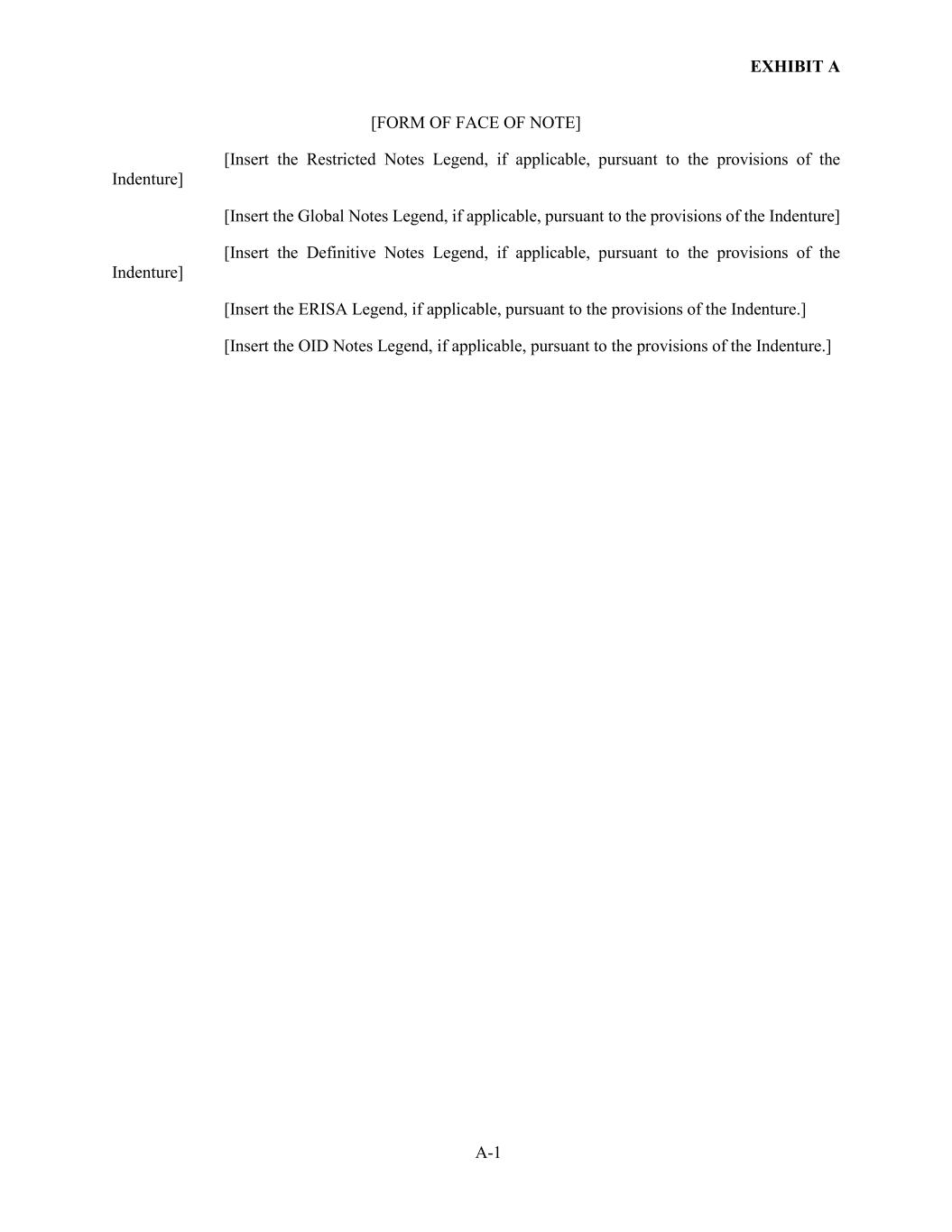 EXHIBIT A A-1 [FORM OF FACE OF NOTE] [Insert the Restricted Notes Legend, if applicable, pursuant to the provisions of the Indenture] [Insert the Global Notes Legend, if applicable, pursuant to the provisions of the Indenture] [Insert the Definitive Notes Legend, if applicable, pursuant to the provisions of the Indenture] [Insert the ERISA Legend, if applicable, pursuant to the provisions of the Indenture.] [Insert the OID Notes Legend, if applicable, pursuant to the provisions of the Indenture.]