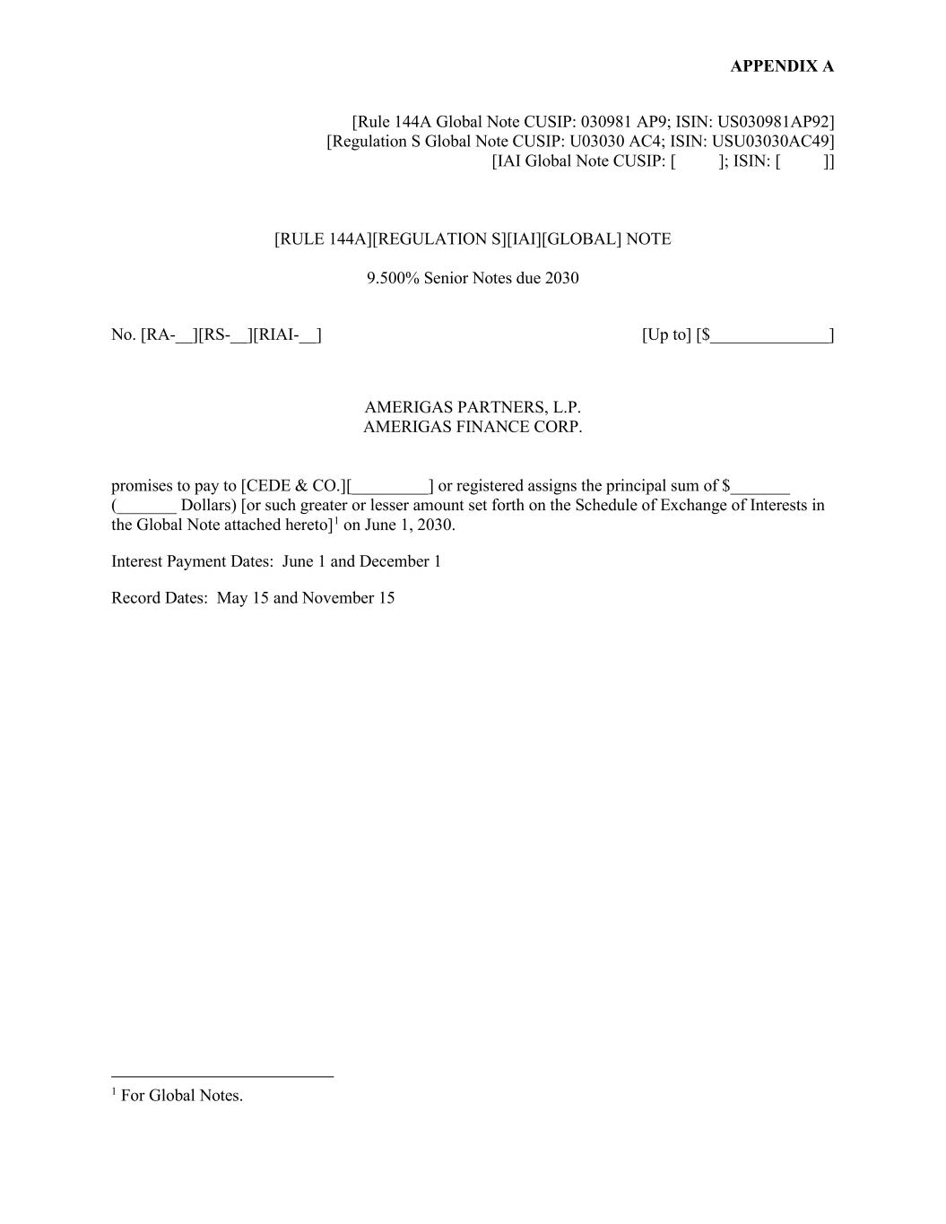 APPENDIX A [Rule 144A Global Note CUSIP: 030981 AP9; ISIN: US030981AP92] [Regulation S Global Note CUSIP: U03030 AC4; ISIN: USU03030AC49] [IAI Global Note CUSIP: [ ]; ISIN: [ ]] [RULE 144A][REGULATION S][IAI][GLOBAL] NOTE 9.500% Senior Notes due 2030 No. [RA-__][RS-__][RIAI-__] [Up to] [$______________] AMERIGAS PARTNERS, L.P. AMERIGAS FINANCE CORP. promises to pay to [CEDE & CO.][_________] or registered assigns the principal sum of $_______ (_______ Dollars) [or such greater or lesser amount set forth on the Schedule of Exchange of Interests in the Global Note attached hereto]1 on June 1, 2030. Interest Payment Dates: June 1 and December 1 Record Dates: May 15 and November 15 1 For Global Notes.