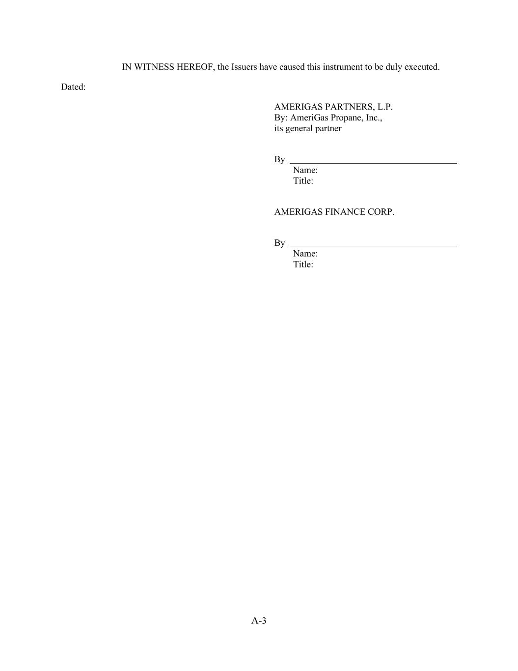 A-3 IN WITNESS HEREOF, the Issuers have caused this instrument to be duly executed. Dated: AMERIGAS PARTNERS, L.P. By: AmeriGas Propane, Inc., its general partner By Name: Title: AMERIGAS FINANCE CORP. By Name: Title: