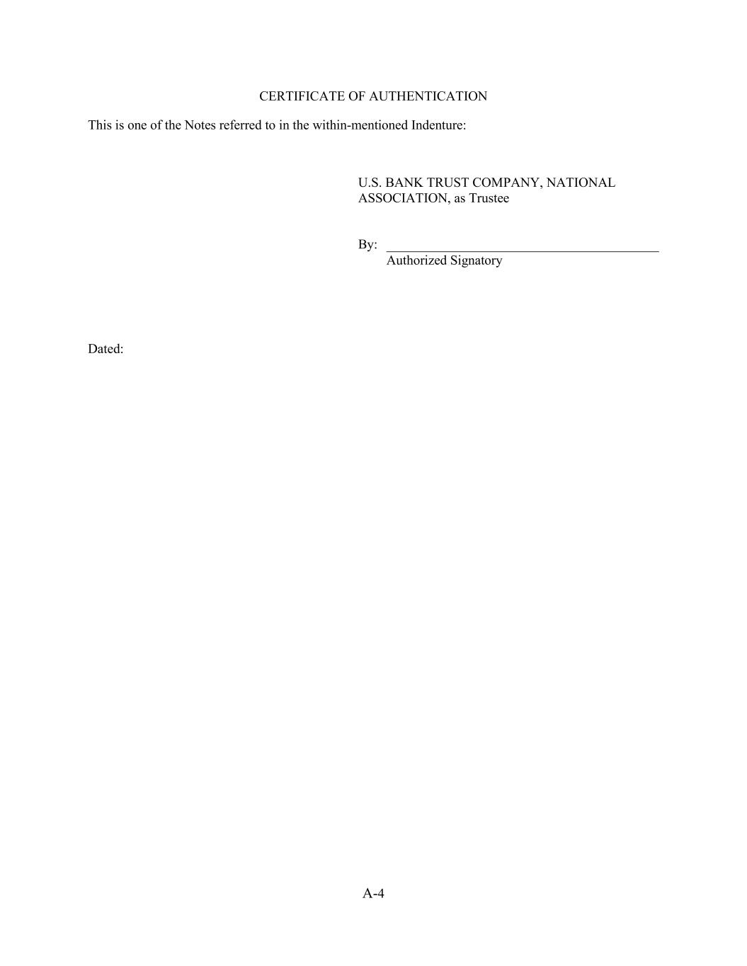 A-4 CERTIFICATE OF AUTHENTICATION This is one of the Notes referred to in the within-mentioned Indenture: U.S. BANK TRUST COMPANY, NATIONAL ASSOCIATION, as Trustee By: Authorized Signatory Dated: