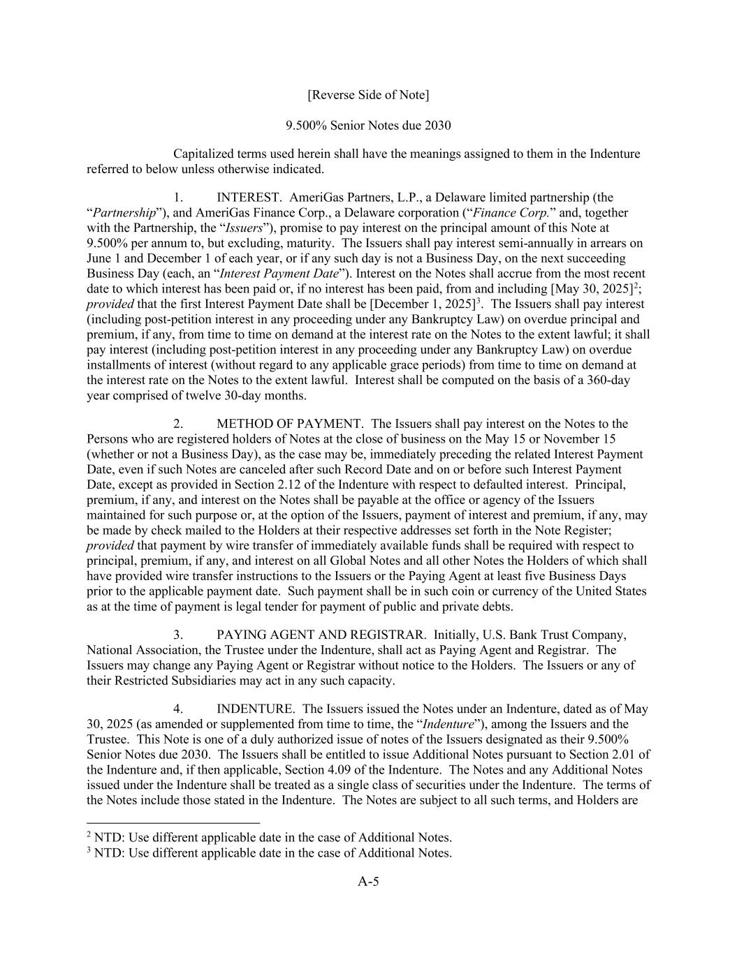 A-5 [Reverse Side of Note] 9.500% Senior Notes due 2030 Capitalized terms used herein shall have the meanings assigned to them in the Indenture referred to below unless otherwise indicated. 1. INTEREST. AmeriGas Partners, L.P., a Delaware limited partnership (the “Partnership”), and AmeriGas Finance Corp., a Delaware corporation (“Finance Corp.” and, together with the Partnership, the “Issuers”), promise to pay interest on the principal amount of this Note at 9.500% per annum to, but excluding, maturity. The Issuers shall pay interest semi-annually in arrears on June 1 and December 1 of each year, or if any such day is not a Business Day, on the next succeeding Business Day (each, an “Interest Payment Date”). Interest on the Notes shall accrue from the most recent date to which interest has been paid or, if no interest has been paid, from and including [May 30, 2025]2; provided that the first Interest Payment Date shall be [December 1, 2025]3. The Issuers shall pay interest (including post-petition interest in any proceeding under any Bankruptcy Law) on overdue principal and premium, if any, from time to time on demand at the interest rate on the Notes to the extent lawful; it shall pay interest (including post-petition interest in any proceeding under any Bankruptcy Law) on overdue installments of interest (without regard to any applicable grace periods) from time to time on demand at the interest rate on the Notes to the extent lawful. Interest shall be computed on the basis of a 360-day year comprised of twelve 30-day months. 2. METHOD OF PAYMENT. The Issuers shall pay interest on the Notes to the Persons who are registered holders of Notes at the close of business on the May 15 or November 15 (whether or not a Business Day), as the case may be, immediately preceding the related Interest Payment Date, even if such Notes are canceled after such Record Date and on or before such Interest Payment Date, except as provided in Section 2.12 of the Indenture with respect to defaulted interest. Principal, premium, if any, and interest on the Notes shall be payable at the office or agency of the Issuers maintained for such purpose or, at the option of the Issuers, payment of interest and premium, if any, may be made by check mailed to the Holders at their respective addresses set forth in the Note Register; provided that payment by wire transfer of immediately available funds shall be required with respect to principal, premium, if any, and interest on all Global Notes and all other Notes the Holders of which shall have provided wire transfer instructions to the Issuers or the Paying Agent at least five Business Days prior to the applicable payment date. Such payment shall be in such coin or currency of the United States as at the time of payment is legal tender for payment of public and private debts. 3. PAYING AGENT AND REGISTRAR. Initially, U.S. Bank Trust Company, National Association, the Trustee under the Indenture, shall act as Paying Agent and Registrar. The Issuers may change any Paying Agent or Registrar without notice to the Holders. The Issuers or any of their Restricted Subsidiaries may act in any such capacity. 4. INDENTURE. The Issuers issued the Notes under an Indenture, dated as of May 30, 2025 (as amended or supplemented from time to time, the “Indenture”), among the Issuers and the Trustee. This Note is one of a duly authorized issue of notes of the Issuers designated as their 9.500% Senior Notes due 2030. The Issuers shall be entitled to issue Additional Notes pursuant to Section 2.01 of the Indenture and, if then applicable, Section 4.09 of the Indenture. The Notes and any Additional Notes issued under the Indenture shall be treated as a single class of securities under the Indenture. The terms of the Notes include those stated in the Indenture. The Notes are subject to all such terms, and Holders are 2 NTD: Use different applicable date in the case of Additional Notes. 3 NTD: Use different applicable date in the case of Additional Notes.