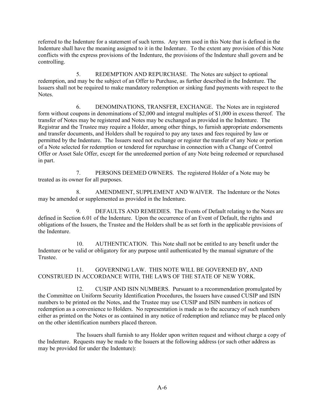A-6 referred to the Indenture for a statement of such terms. Any term used in this Note that is defined in the Indenture shall have the meaning assigned to it in the Indenture. To the extent any provision of this Note conflicts with the express provisions of the Indenture, the provisions of the Indenture shall govern and be controlling. 5. REDEMPTION AND REPURCHASE. The Notes are subject to optional redemption, and may be the subject of an Offer to Purchase, as further described in the Indenture. The Issuers shall not be required to make mandatory redemption or sinking fund payments with respect to the Notes. 6. DENOMINATIONS, TRANSFER, EXCHANGE. The Notes are in registered form without coupons in denominations of $2,000 and integral multiples of $1,000 in excess thereof. The transfer of Notes may be registered and Notes may be exchanged as provided in the Indenture. The Registrar and the Trustee may require a Holder, among other things, to furnish appropriate endorsements and transfer documents, and Holders shall be required to pay any taxes and fees required by law or permitted by the Indenture. The Issuers need not exchange or register the transfer of any Note or portion of a Note selected for redemption or tendered for repurchase in connection with a Change of Control Offer or Asset Sale Offer, except for the unredeemed portion of any Note being redeemed or repurchased in part. 7. PERSONS DEEMED OWNERS. The registered Holder of a Note may be treated as its owner for all purposes. 8. AMENDMENT, SUPPLEMENT AND WAIVER. The Indenture or the Notes may be amended or supplemented as provided in the Indenture. 9. DEFAULTS AND REMEDIES. The Events of Default relating to the Notes are defined in Section 6.01 of the Indenture. Upon the occurrence of an Event of Default, the rights and obligations of the Issuers, the Trustee and the Holders shall be as set forth in the applicable provisions of the Indenture. 10. AUTHENTICATION. This Note shall not be entitled to any benefit under the Indenture or be valid or obligatory for any purpose until authenticated by the manual signature of the Trustee. 11. GOVERNING LAW. THIS NOTE WILL BE GOVERNED BY, AND CONSTRUED IN ACCORDANCE WITH, THE LAWS OF THE STATE OF NEW YORK. 12. CUSIP AND ISIN NUMBERS. Pursuant to a recommendation promulgated by the Committee on Uniform Security Identification Procedures, the Issuers have caused CUSIP and ISIN numbers to be printed on the Notes, and the Trustee may use CUSIP and ISIN numbers in notices of redemption as a convenience to Holders. No representation is made as to the accuracy of such numbers either as printed on the Notes or as contained in any notice of redemption and reliance may be placed only on the other identification numbers placed thereon. The Issuers shall furnish to any Holder upon written request and without charge a copy of the Indenture. Requests may be made to the Issuers at the following address (or such other address as may be provided for under the Indenture):