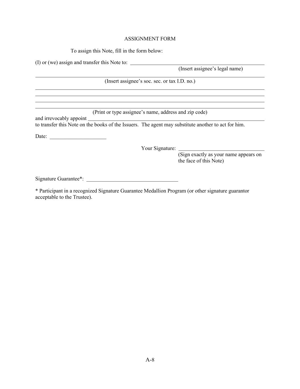 A-8 ASSIGNMENT FORM To assign this Note, fill in the form below: (I) or (we) assign and transfer this Note to: (Insert assignee’s legal name) (Insert assignee’s soc. sec. or tax I.D. no.) (Print or type assignee’s name, address and zip code) and irrevocably appoint to transfer this Note on the books of the Issuers. The agent may substitute another to act for him. Date: _____________________ Your Signature: (Sign exactly as your name appears on the face of this Note) Signature Guarantee*: __________________________________ * Participant in a recognized Signature Guarantee Medallion Program (or other signature guarantor acceptable to the Trustee).