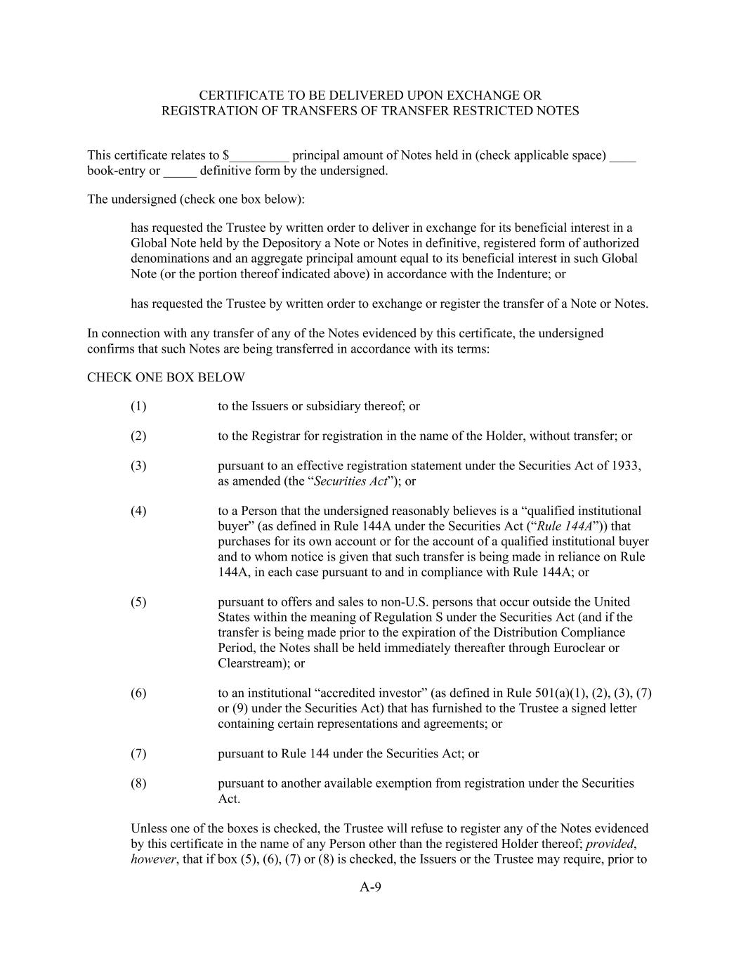 A-9 CERTIFICATE TO BE DELIVERED UPON EXCHANGE OR REGISTRATION OF TRANSFERS OF TRANSFER RESTRICTED NOTES This certificate relates to $_________ principal amount of Notes held in (check applicable space) ____ book-entry or _____ definitive form by the undersigned. The undersigned (check one box below): has requested the Trustee by written order to deliver in exchange for its beneficial interest in a Global Note held by the Depository a Note or Notes in definitive, registered form of authorized denominations and an aggregate principal amount equal to its beneficial interest in such Global Note (or the portion thereof indicated above) in accordance with the Indenture; or has requested the Trustee by written order to exchange or register the transfer of a Note or Notes. In connection with any transfer of any of the Notes evidenced by this certificate, the undersigned confirms that such Notes are being transferred in accordance with its terms: CHECK ONE BOX BELOW (1) to the Issuers or subsidiary thereof; or (2) to the Registrar for registration in the name of the Holder, without transfer; or (3) pursuant to an effective registration statement under the Securities Act of 1933, as amended (the “Securities Act”); or (4) to a Person that the undersigned reasonably believes is a “qualified institutional buyer” (as defined in Rule 144A under the Securities Act (“Rule 144A”)) that purchases for its own account or for the account of a qualified institutional buyer and to whom notice is given that such transfer is being made in reliance on Rule 144A, in each case pursuant to and in compliance with Rule 144A; or (5) pursuant to offers and sales to non-U.S. persons that occur outside the United States within the meaning of Regulation S under the Securities Act (and if the transfer is being made prior to the expiration of the Distribution Compliance Period, the Notes shall be held immediately thereafter through Euroclear or Clearstream); or (6) to an institutional “accredited investor” (as defined in Rule 501(a)(1), (2), (3), (7) or (9) under the Securities Act) that has furnished to the Trustee a signed letter containing certain representations and agreements; or (7) pursuant to Rule 144 under the Securities Act; or (8) pursuant to another available exemption from registration under the Securities Act. Unless one of the boxes is checked, the Trustee will refuse to register any of the Notes evidenced by this certificate in the name of any Person other than the registered Holder thereof; provided, however, that if box (5), (6), (7) or (8) is checked, the Issuers or the Trustee may require, prior to