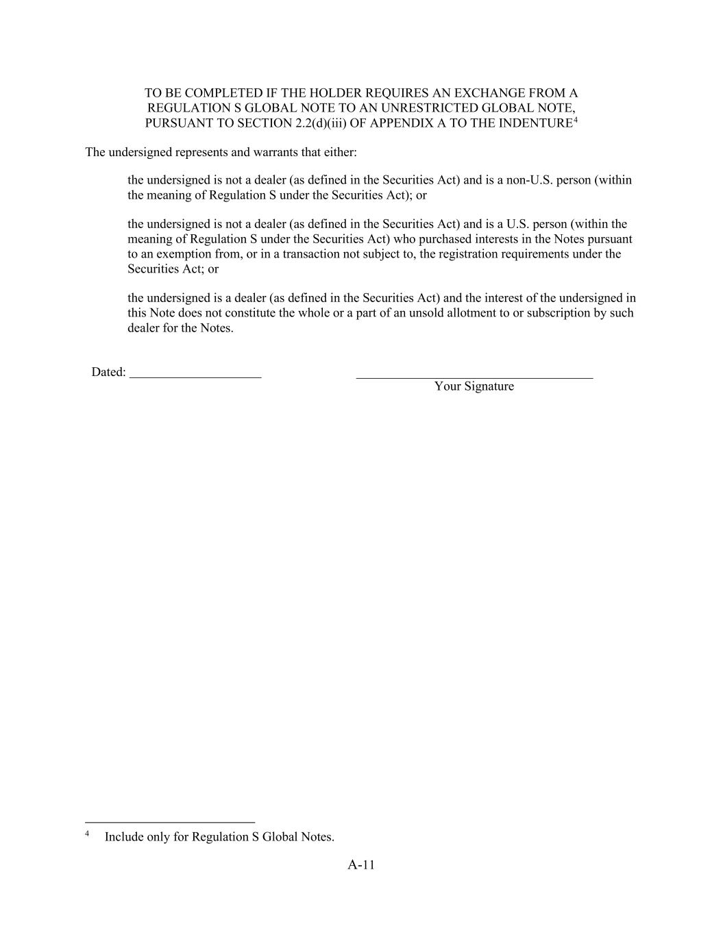A-11 TO BE COMPLETED IF THE HOLDER REQUIRES AN EXCHANGE FROM A REGULATION S GLOBAL NOTE TO AN UNRESTRICTED GLOBAL NOTE, PURSUANT TO SECTION 2.2(d)(iii) OF APPENDIX A TO THE INDENTURE4 The undersigned represents and warrants that either: the undersigned is not a dealer (as defined in the Securities Act) and is a non-U.S. person (within the meaning of Regulation S under the Securities Act); or the undersigned is not a dealer (as defined in the Securities Act) and is a U.S. person (within the meaning of Regulation S under the Securities Act) who purchased interests in the Notes pursuant to an exemption from, or in a transaction not subject to, the registration requirements under the Securities Act; or the undersigned is a dealer (as defined in the Securities Act) and the interest of the undersigned in this Note does not constitute the whole or a part of an unsold allotment to or subscription by such dealer for the Notes. Dated: Your Signature 4 Include only for Regulation S Global Notes.