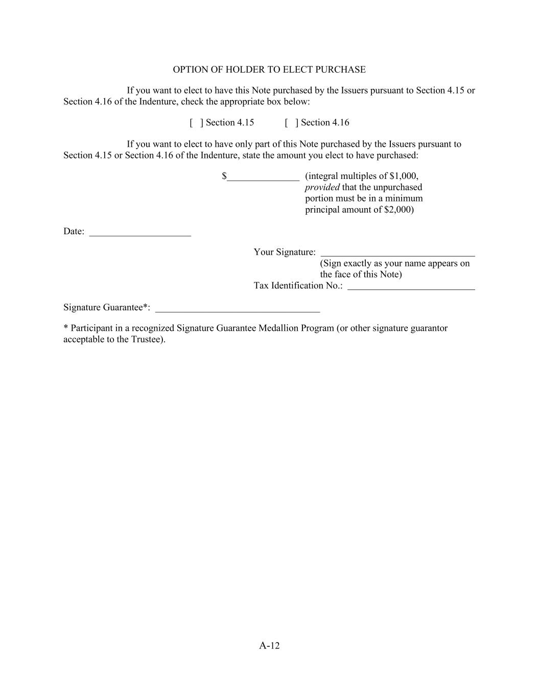 A-12 OPTION OF HOLDER TO ELECT PURCHASE If you want to elect to have this Note purchased by the Issuers pursuant to Section 4.15 or Section 4.16 of the Indenture, check the appropriate box below: [ ] Section 4.15 [ ] Section 4.16 If you want to elect to have only part of this Note purchased by the Issuers pursuant to Section 4.15 or Section 4.16 of the Indenture, state the amount you elect to have purchased: $_______________ (integral multiples of $1,000, provided that the unpurchased portion must be in a minimum principal amount of $2,000) Date: _____________________ Your Signature: (Sign exactly as your name appears on the face of this Note) Tax Identification No.: Signature Guarantee*: __________________________________ * Participant in a recognized Signature Guarantee Medallion Program (or other signature guarantor acceptable to the Trustee).