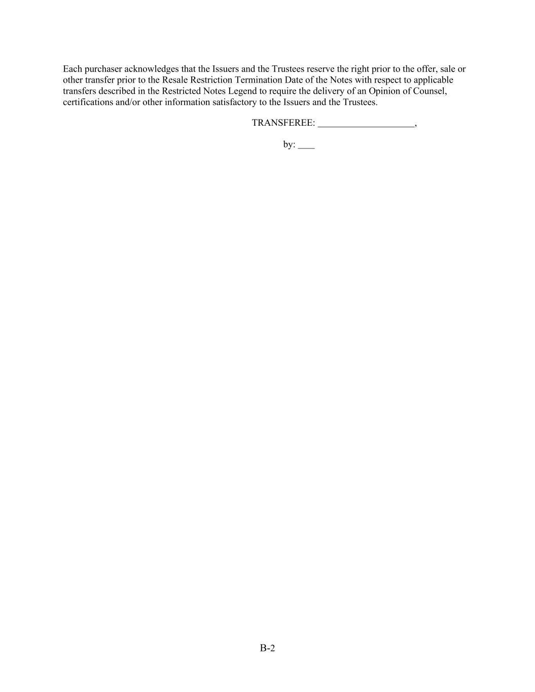 B-2 Each purchaser acknowledges that the Issuers and the Trustees reserve the right prior to the offer, sale or other transfer prior to the Resale Restriction Termination Date of the Notes with respect to applicable transfers described in the Restricted Notes Legend to require the delivery of an Opinion of Counsel, certifications and/or other information satisfactory to the Issuers and the Trustees. TRANSFEREE: , by: