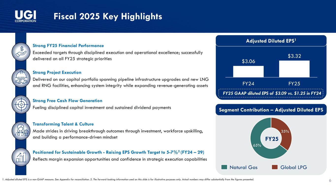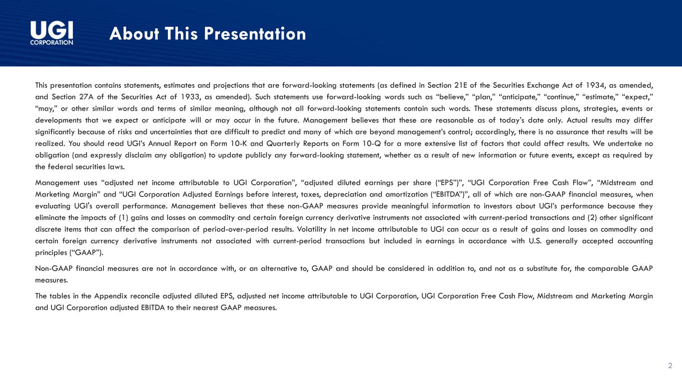 About This Presentation This presentation contains statements, estimates and projections that are forward-looking statements (as defined in Section 21E of the Securities Exchange Act of 1934, as amended, and Section 27A of the Securities Act of 1933, as amended). Such statements use forward-looking words such as “believe,” “plan,” “anticipate,” “continue,” “estimate,” “expect,” “may,” or other similar words and terms of similar meaning, although not all forward-looking statements contain such words. These statements discuss plans, strategies, events or developments that we expect or anticipate will or may occur in the future. Management believes that these are reasonable as of today’s date only. Actual results may differ significantly because of risks and uncertainties that are difficult to predict and many of which are beyond management’s control; accordingly, there is no assurance that results will be realized. You should read UGI’s Annual Report on Form 10-K and Quarterly Reports on Form 10-Q for a more extensive list of factors that could affect results. We undertake no obligation (and expressly disclaim any obligation) to update publicly any forward-looking statement, whether as a result of new information or future events, except as required by the federal securities laws. Management uses “adjusted net income attributable to UGI Corporation”, “adjusted diluted earnings per share (“EPS”)”, “UGI Corporation Free Cash Flow”, “Midstream and Marketing Margin” and “UGI Corporation Adjusted Earnings before interest, taxes, depreciation and amortization (“EBITDA”)”, all of which are non-GAAP financial measures, when evaluating UGI's overall performance. Management believes that these non-GAAP measures provide meaningful information to investors about UGI’s performance because they eliminate the impacts of (1) gains and losses on commodity and certain foreign currency derivative instruments not associated with current-period transactions and (2) other significant discrete items that can affect the comparison of period-over-period results. Volatility in net income attributable to UGI can occur as a result of gains and losses on commodity and certain foreign currency derivative instruments not associated with current-period transactions but included in earnings in accordance with U.S. generally accepted accounting principles (“GAAP”). Non-GAAP financial measures are not in accordance with, or an alternative to, GAAP and should be considered in addition to, and not as a substitute for, the comparable GAAP measures. The tables in the Appendix reconcile adjusted diluted EPS, adjusted net income attributable to UGI Corporation, UGI Corporation Free Cash Flow, Midstream and Marketing Margin and UGI Corporation adjusted EBITDA to their nearest GAAP measures. 2