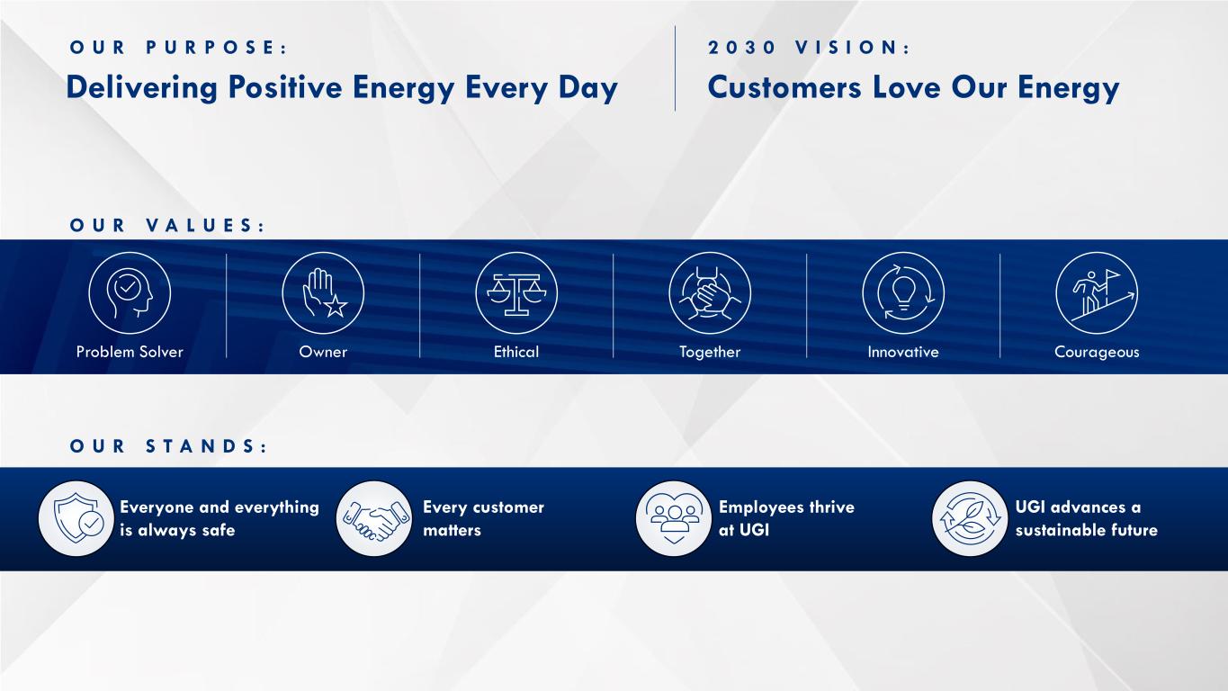 Delivering Positive Energy Every Day O U R P U R P O S E : Customers Love Our Energy 2 0 3 0 V I S I O N : Problem Solver Owner Ethical Together Innovative Courageous O U R V A L U E S : Everyone and everything is always safe Every customer matters Employees thrive at UGI UGI advances a sustainable future O U R S T A N D S :