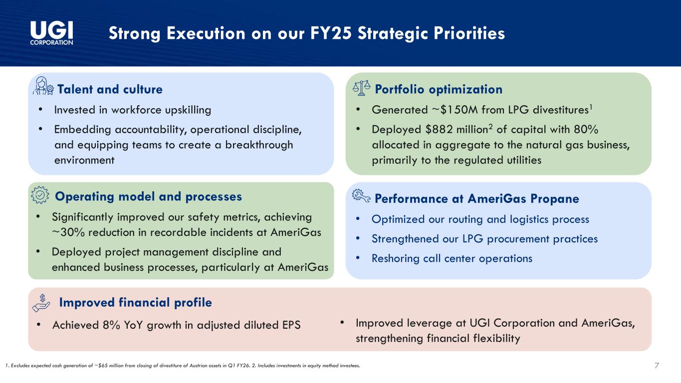 6 Fiscal 2025 Key Highlights Strong FY25 Financial Performance Exceeded targets through disciplined execution and operational excellence; successfully delivered on all FY25 strategic priorities Strong Project Execution Delivered on our capital portfolio spanning pipeline infrastructure upgrades and new LNG and RNG facilities, enhancing system integrity while expanding revenue-generating assets Strong Free Cash Flow Generation Fueling disciplined capital investment and sustained dividend payments Transforming Talent & Culture Made strides in driving breakthrough outcomes through investment, workforce upskilling, and building a performance-driven mindset Positioned for Sustainable Growth - Raising EPS Growth Target to 5-7%2 (FY24 – 29) Reflects margin expansion opportunities and confidence in strategic execution capabilities 35% 65% Adjusted Diluted EPS1 Segment Contribution – Adjusted Diluted EPS $3.06 $3.32 FY24 FY25 Natural Gas Global LPG FY25 1. Adjusted diluted EPS is a non-GAAP measure. See Appendix for reconciliation. 2. The forward-looking information used on this slide is for illustrative purposes only. Actual numbers may differ substantially from the figures presented. FY25 GAAP diluted EPS of $3.09 vs. $1.25 in FY24
