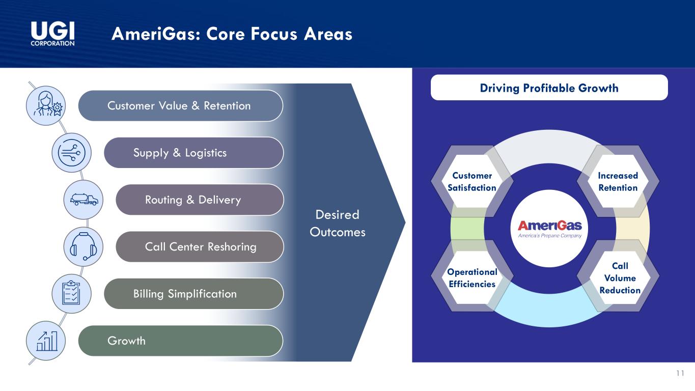 10 AmeriGas: Strategic Pillars Safety First Customer Focus Operational Excellence Workforce Development Financial Discipline Maintaining an uncompromising commitment to safety across all operations with a zero-harm culture Enhancing customer service quality and strengthening relationships as a trusted energy partner Driving efficiency improvements through technology adoption and process optimization Leveraging financial strength to support sustainable growth and deliver consistent value to UGI shareholders Fostering an engaged workforce culture that empowers employees and supports innovation