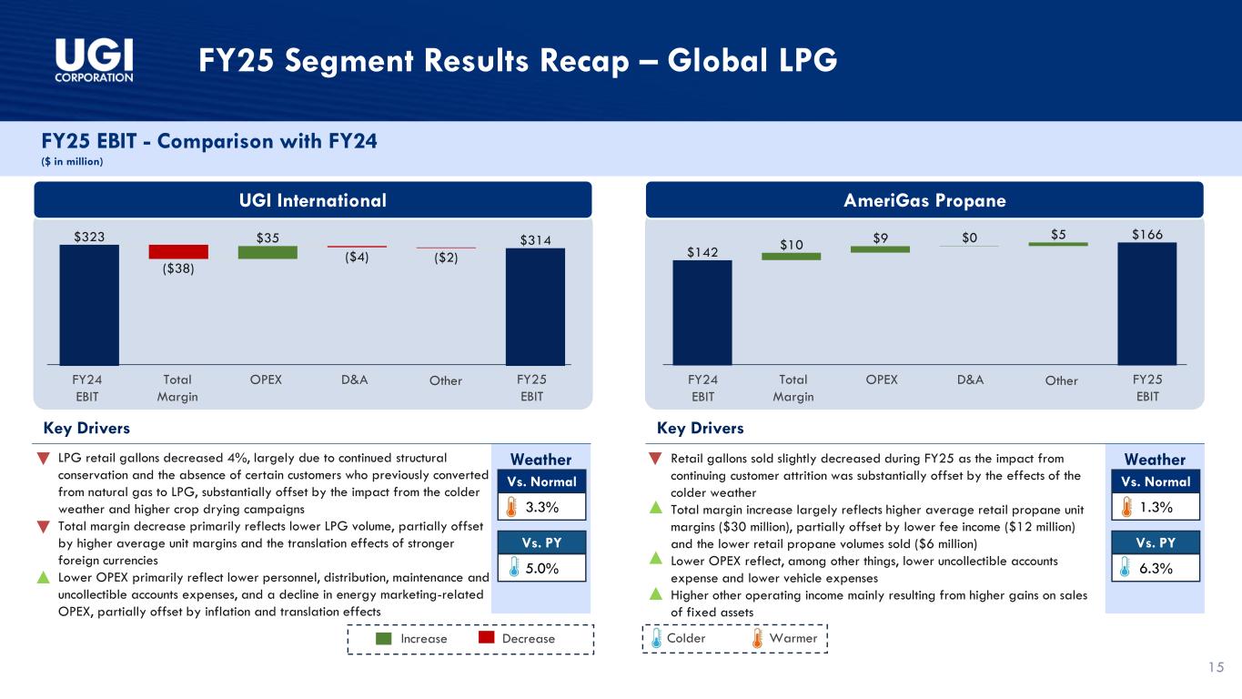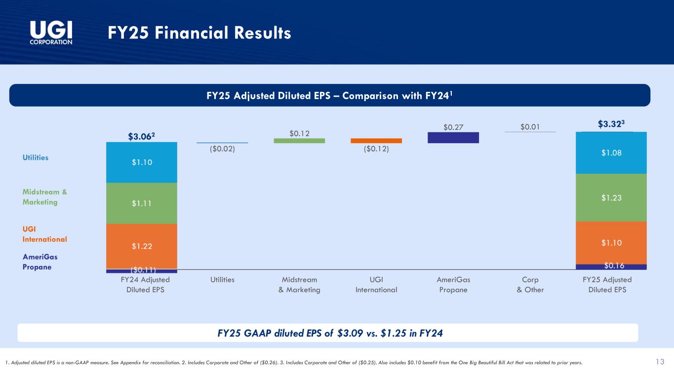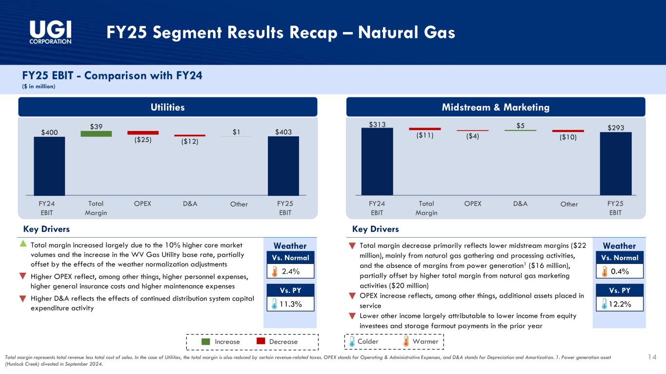 FY25 Financial Results FY25 Adjusted Diluted EPS – Comparison with FY241 1. Adjusted diluted EPS is a non-GAAP measure. See Appendix for reconciliation. 2. Includes Corporate and Other of ($0.26). 3. Includes Corporate and Other of ($0.25). Also includes $0.10 benefit from the One Big Beautiful Bill Act that was related to prior years. FY25 GAAP diluted EPS of $3.09 vs. $1.25 in FY24 13 $3.06 ($0.02) $0.12 ($0.12) $0.27 $0.01 $3.32 FY24 Adjusted Diluted EPS Utilities Midstream & Marketing UGI International AmeriGas Propane Corp & Other FY25 Adjusted Diluted EPS $3.062 $3.323 Utilities Midstream & Marketing UGI International AmeriGas Propane