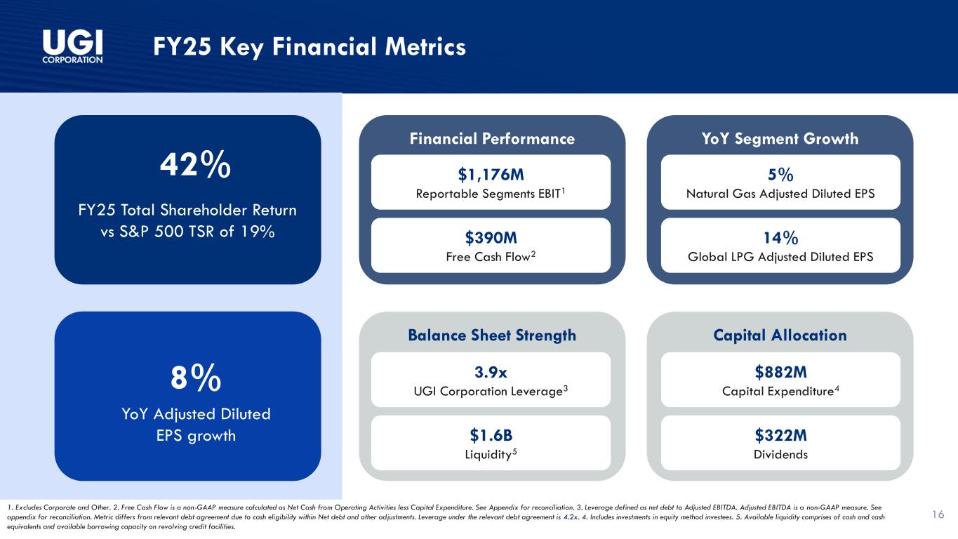 FY25 Segment Results Recap – Global LPG FY25 EBIT - Comparison with FY24 ($ in million) UGI International AmeriGas Propane Weather Key Drivers • LPG retail gallons decreased 4%, largely due to continued structural conservation and the absence of certain customers who previously converted from natural gas to LPG, substantially offset by the impact from the colder weather and higher crop drying campaigns • Total margin decrease primarily reflects lower LPG volume, partially offset by higher average unit margins and the translation effects of stronger foreign currencies • Lower OPEX primarily reflect lower personnel, distribution, maintenance and uncollectible accounts expenses, and a decline in energy marketing-related OPEX, partially offset by inflation and translation effects Increase Decrease WarmerColder Weather Key Drivers • Retail gallons sold slightly decreased during FY25 as the impact from continuing customer attrition was substantially offset by the effects of the colder weather • Total margin increase largely reflects higher average retail propane unit margins ($30 million), partially offset by lower fee income ($12 million) and the lower retail propane volumes sold ($6 million) • Lower OPEX reflect, among other things, lower uncollectible accounts expense and lower vehicle expenses • Higher other operating income mainly resulting from higher gains on sales of fixed assets 3.3% 5.0% Vs. Normal Vs. PY 1.3% 6.3% Vs. Normal Vs. PY FY24 EBIT FY25 EBIT Total Margin OPEX D&A Other FY24 EBIT FY25 EBIT Total Margin OPEX D&A Other 15 $323 ($38) $35 ($4) ($2) $314 $142 $10 $9 $0 $5 $166