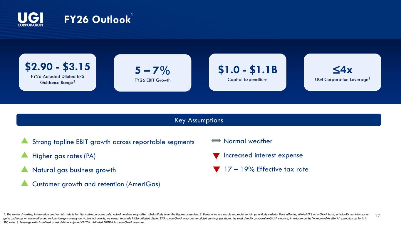 16 FY25 Key Financial Metrics FY25 Total Shareholder Return vs S&P 500 TSR of 19% YoY Adjusted Diluted EPS growth 42% 8% Financial Performance YoY Segment Growth Balance Sheet Strength Capital Allocation $1,176M Reportable Segments EBIT1 $390M Free Cash Flow2 5% Natural Gas Adjusted Diluted EPS 14% Global LPG Adjusted Diluted EPS 3.9x UGI Corporation Leverage3 $1.6B Liquidity5 $882M Capital Expenditure4 $322M Dividends 1. Excludes Corporate and Other. 2. Free Cash Flow is a non-GAAP measure calculated as Net Cash from Operating Activities less Capital Expenditure. See Appendix for reconciliation. 3. Leverage defined as net debt to Adjusted EBITDA. Adjusted EBITDA is a non-GAAP measure. See appendix for reconciliation. Metric differs from relevant debt agreement due to cash eligibility within Net debt and other adjustments. Leverage under the relevant debt agreement is 4.2x. 4. Includes investments in equity method investees. 5. Available liquidity comprises of cash and cash equivalents and available borrowing capacity on revolving credit facilities.