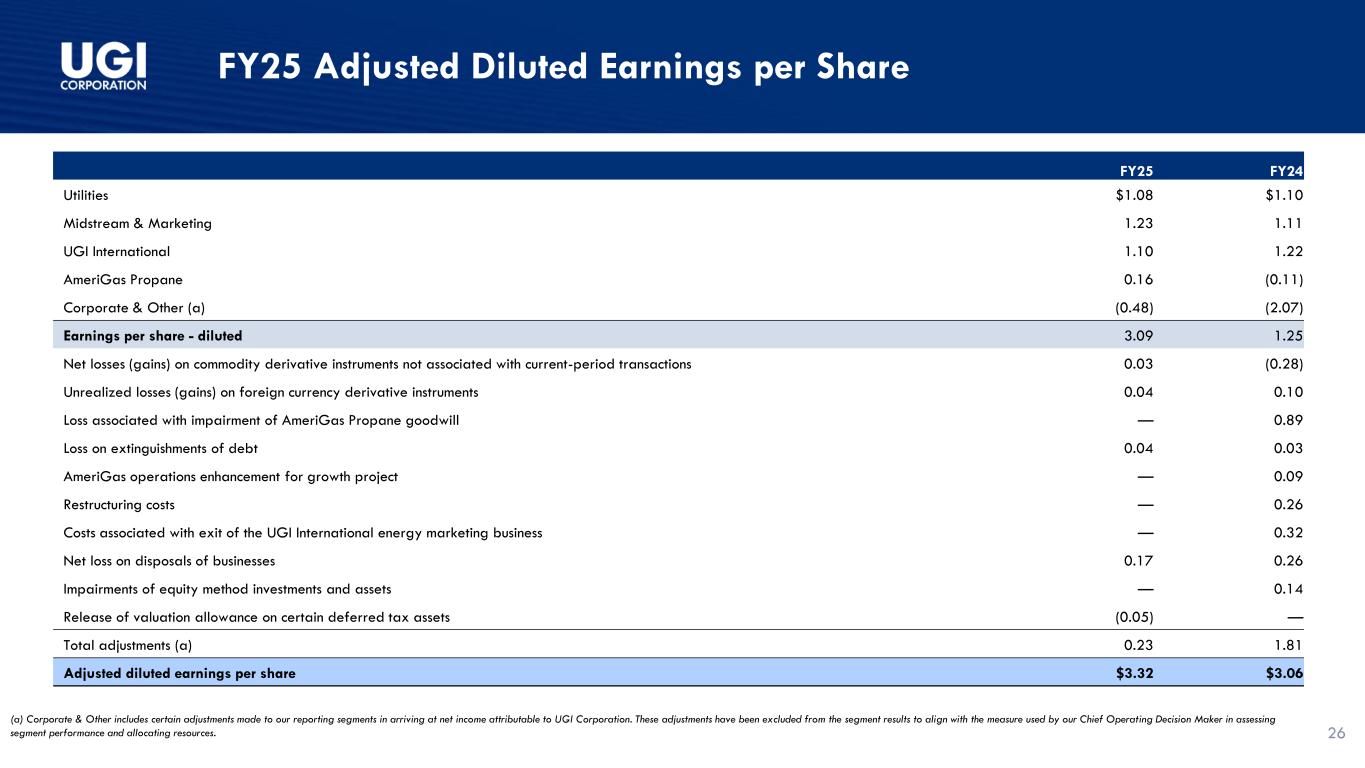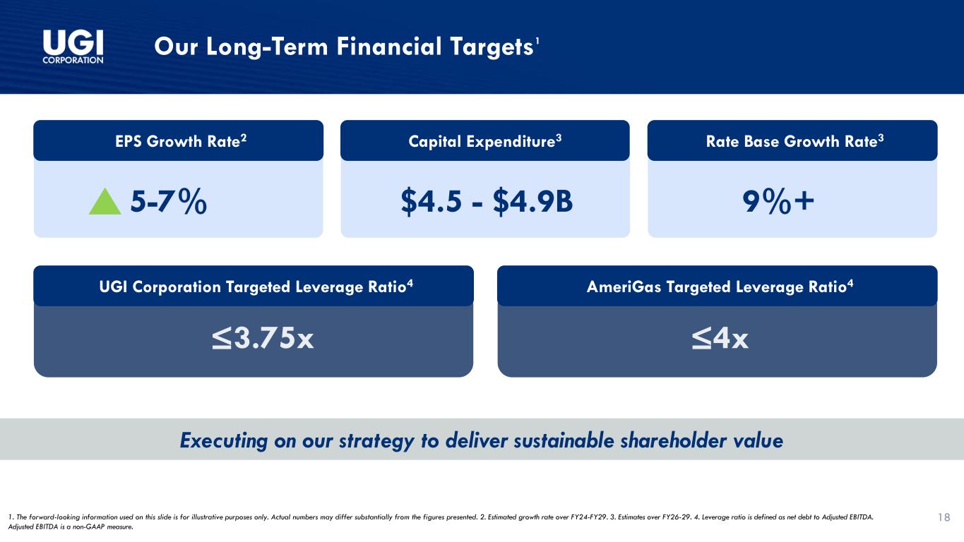 17 FY26 Outlook ▪ Strong topline EBIT growth across reportable segments ▪ Higher gas rates (PA) ▪ Natural gas business growth ▪ Customer growth and retention (AmeriGas) Key Assumptions $2.90 - $3.15 FY26 Adjusted Diluted EPS Guidance Range2 5 – 7% FY26 EBIT Growth $1.0 - $1.1B Capital Expenditure ≤4x UGI Corporation Leverage3 1. The forward-looking information used on this slide is for illustrative purposes only. Actual numbers may differ substantially from the figures presented. 2. Because we are unable to predict certain potentially material items affecting diluted EPS on a GAAP basis, principally mark-to-market gains and losses on commodity and certain foreign currency derivative instruments, we cannot reconcile FY26 adjusted diluted EPS, a non-GAAP measure, to diluted earnings per share, the most directly comparable GAAP measure, in reliance on the “unreasonable efforts” exception set forth in SEC rules. 3. Leverage ratio is defined as net debt to Adjusted EBITDA. Adjusted EBITDA is a non-GAAP measure. 1 ▪ Normal weather ▪ Increased interest expense ▪ 17 – 19% Effective tax rate