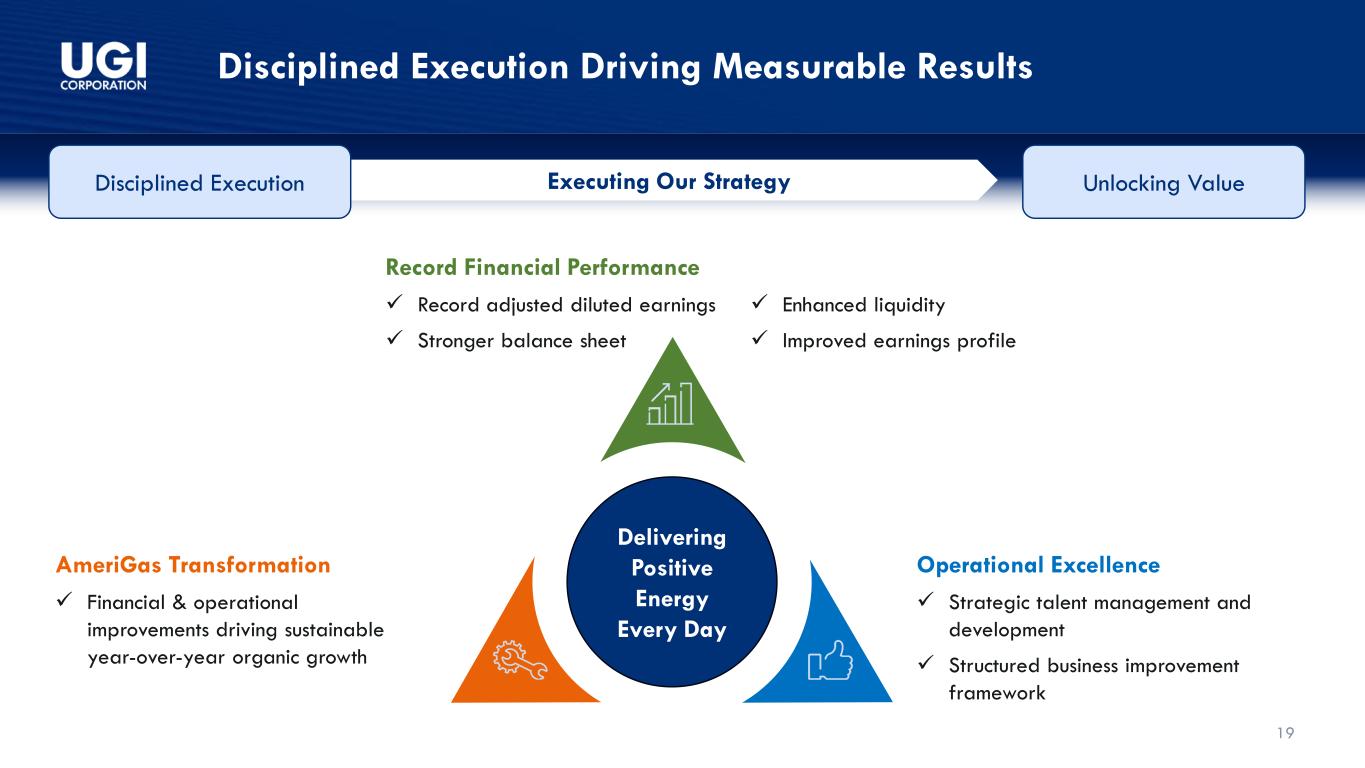 Our Long-Term Financial Targets 1. The forward-looking information used on this slide is for illustrative purposes only. Actual numbers may differ substantially from the figures presented. 2. Estimated growth rate over FY24-FY29. 3. Estimates over FY26-29. 4. Leverage ratio is defined as net debt to Adjusted EBITDA. Adjusted EBITDA is a non-GAAP measure. Executing on our strategy to deliver sustainable shareholder value 5-7% $4.5 - $4.9B 9%+ 1 EPS Growth Rate2 Capital Expenditure3 Rate Base Growth Rate3 UGI Corporation Targeted Leverage Ratio4 ≤3.75x ≤4x AmeriGas Targeted Leverage Ratio4 18