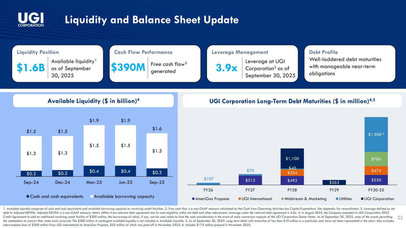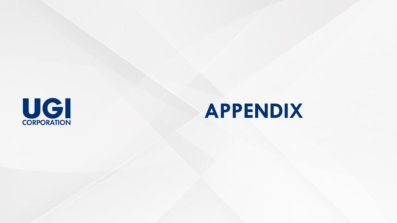 Liquidity and Balance Sheet Update 1. Available liquidity comprises of cash and cash equivalents and available borrowing capacity on revolving credit facilities. 2. Free cash flow is a non-GAAP measure calculated as Net Cash from Operating Activities less Capital Expenditure. See Appendix for reconciliation. 3. Leverage defined as net debt to Adjusted EBITDA. Adjusted EBITDA is a non-GAAP measure. Metric differs from relevant debt agreement due to cash eligibility within net debt and other adjustments. Leverage under the relevant debt agreement is 4.2x. 4. In August 2025, the Company amended its UGI Corporation 2025 Credit Agreement to add an additional revolving credit facility of $300 million, the borrowings of which, if any, can be used solely to fund the cash consideration in the event of early conversion requests of the UGI Corporation Senior Notes. As of September 30, 2025, none of the events permitting the noteholders to convert their notes early occurred. The $300 million in contingent available liquidity is not included in Available Liquidity. 5. As of September 30, 2025. Long-term debts with maturities of less than $10 million in a particular year have not been represented in the chart. Also excludes intercompany loan of $200 million from UGI International to AmeriGas Propane, $35 million of which was paid off in November 2025. 6. Includes $175 million prepaid in November 2025. UGI Corporation Long-Term Debt Maturities ($ in million)4,5Available Liquidity ($ in billion)4 Liquidity Position Cash Flow Performance Leverage Management Debt Profile Well-laddered debt maturities with manageable near-term obligations Free cash flow2 generated Leverage at UGI Corporation3 as of September 30, 2025 Available liquidity1 as of September 30, 2025 $1.6B $390M 3.9x 22 $0.2 $0.2 $0.4 $0.4 $0.3 $1.3 $1.3 $1.5 $1.5 $1.3 $1.5 $1.5 $1.9 $1.9 $1.6 Sep-24 Dec-24 Mar-25 Jun-25 Sep-25 Cash and cash equivalents Available borrowing capacity $512 $493 $550 $354 $474 $786 $107 $70 $40 $1,900 6 $1,100 $263 FY26 FY27 FY28 FY29 FY30-55 AmeriGas Propane UGI International Midstream & Marketing Utilities UGI Corporation