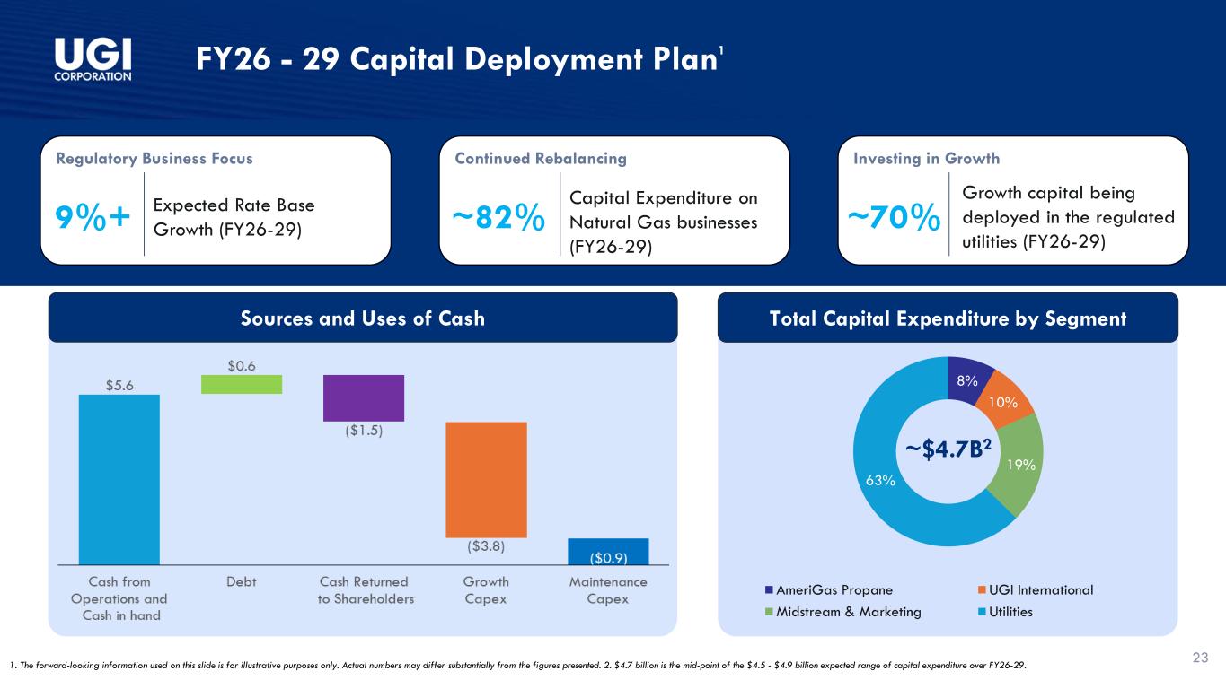 FY26 - 29 Capital Deployment Plan1 1. The forward-looking information used on this slide is for illustrative purposes only. Actual numbers may differ substantially from the figures presented. 2. $4.7 billion is the mid-point of the $4.5 - $4.9 billion expected range of capital expenditure over FY26-29. Regulatory Business Focus Continued Rebalancing Investing in Growth Capital Expenditure on Natural Gas businesses (FY26-29) ~82% Growth capital being deployed in the regulated utilities (FY26-29) ~70% Sources and Uses of Cash Total Capital Expenditure by Segment 8% 10% 19% 63% AmeriGas Propane UGI International Midstream & Marketing Utilities ~$4.7B2 9%+ Expected Rate Base Growth (FY26-29) 23